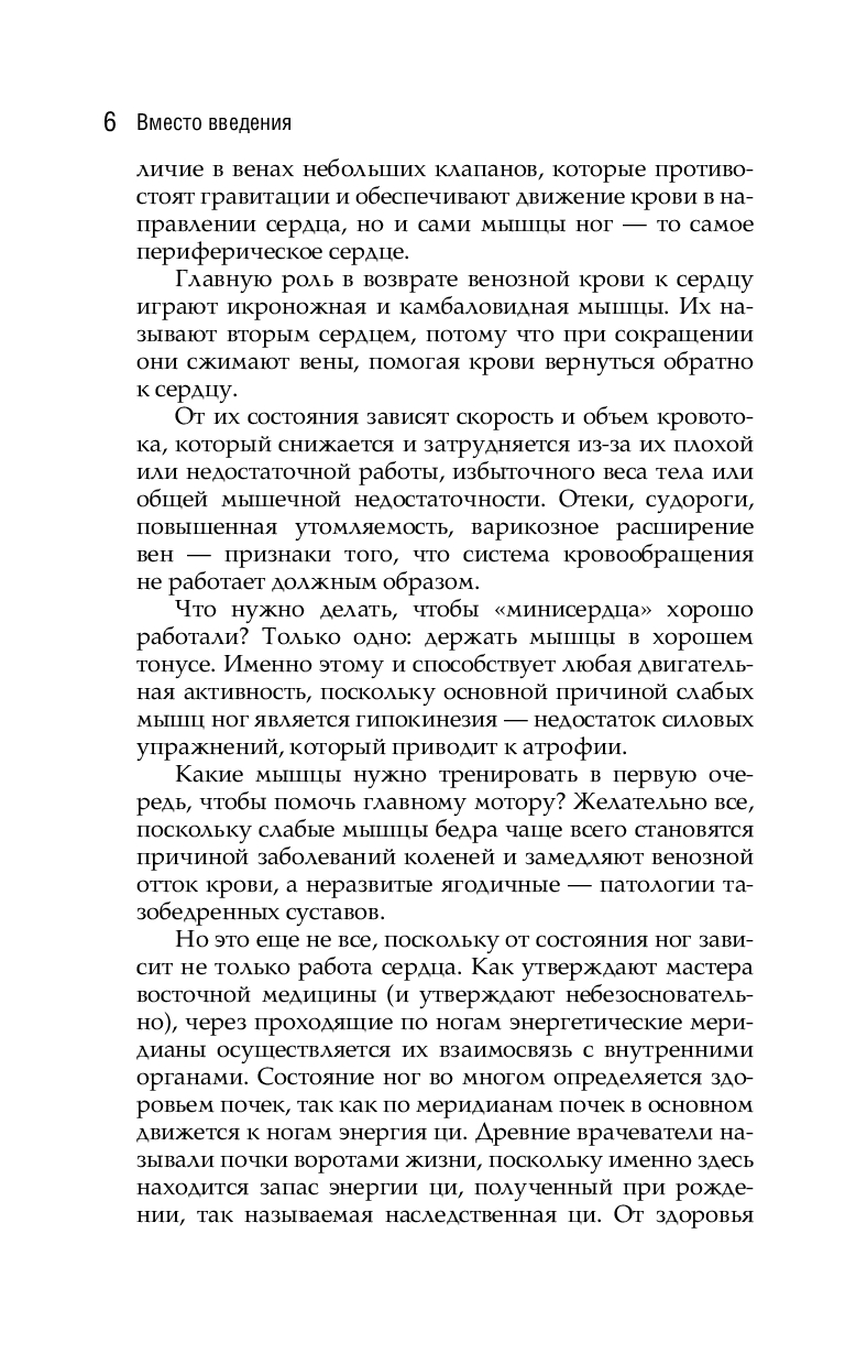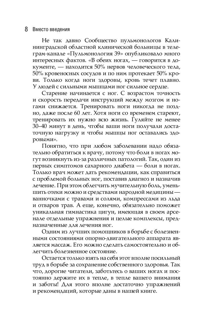 Александр Ушаков, опираясь на древнейшую концепцию цигун (единение духа и тела), собрал в этой книге лучшие упражнения и техники. Они помогут в лечении и профилактике таких заболеваний как варикоз, пяточная шпора, артрит, атеросклероз, хандроз, плоскостопие, а также повысят общий тонус мышц и сосудов ног.