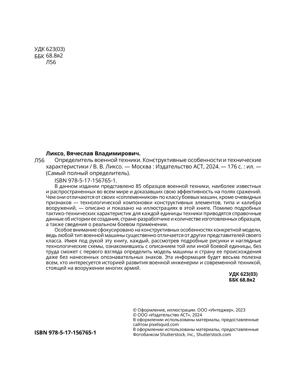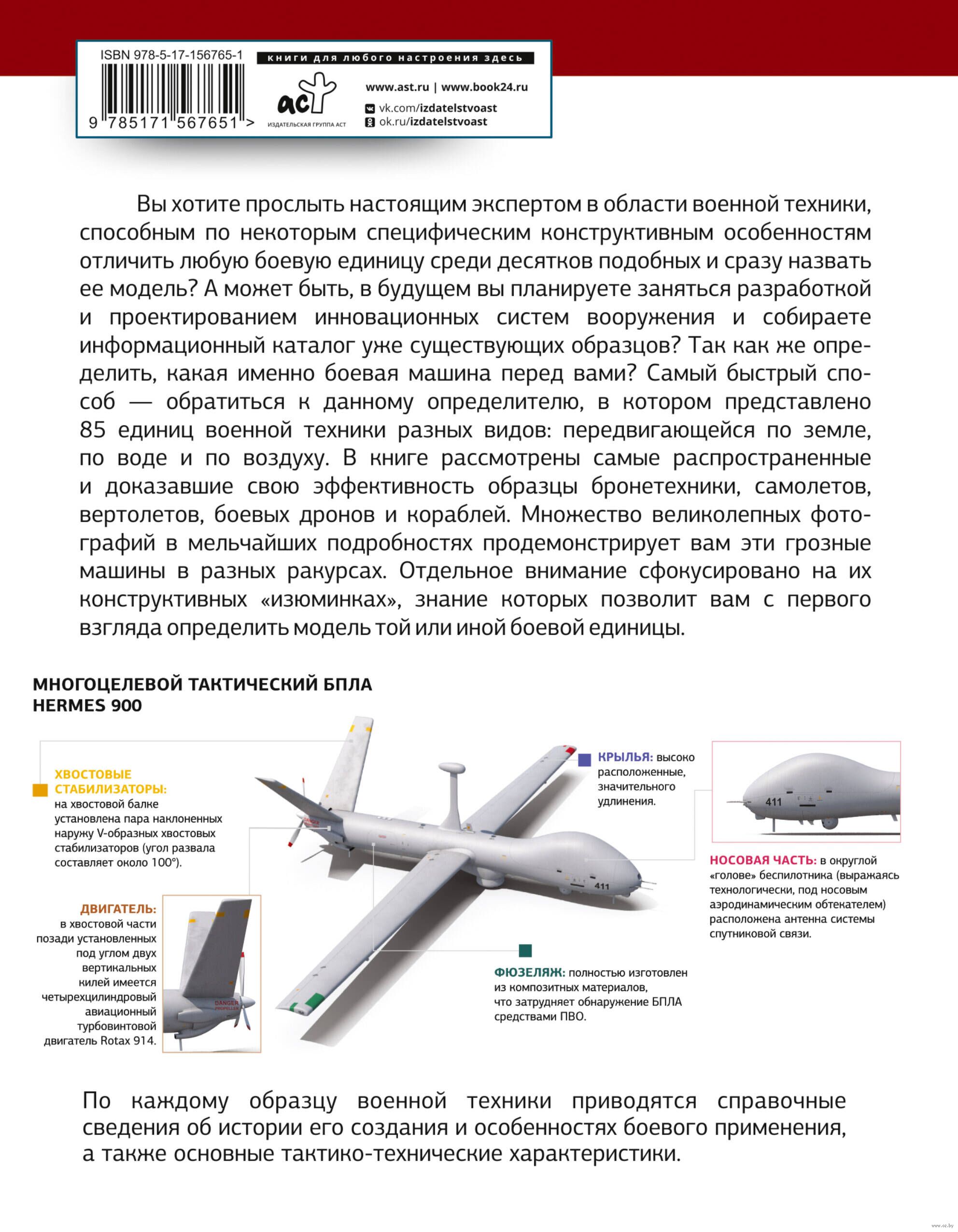 Вы хотите прослыть настоящим экспертом в области военной техники, способным по некоторым специфическим конструктивным особенностям отличить любую боевую единицу среди десятков подобных и сразу назвать ее модель? А может быть, в будущем вы планируете заняться разработкой и проектированием инновационных систем вооружения и собираете информационный каталог уже существующих образцов? Так как же определить, какая именно боевая машина перед вами? Самый быстрый способ – обратиться к данному определителю, в котором представлено 85 единиц военной техники разных видов: передвигающейся по земле, по воде и по воздуху. В книге представлены самые распространенные и доказавшие свою эффективность образцы бронетехники, самолетов, вертолетов, боевых дронов и кораблей. Множество великолепных фотографий в мельчайших подробностях продемонстрирует вам эти грозные машины в разных ракурсах. Отдельное внимание сфокусировано на их конструктивных "изюминках", знание которых позволит вам с первого взгляда определить модель той или иной боевой единицы.