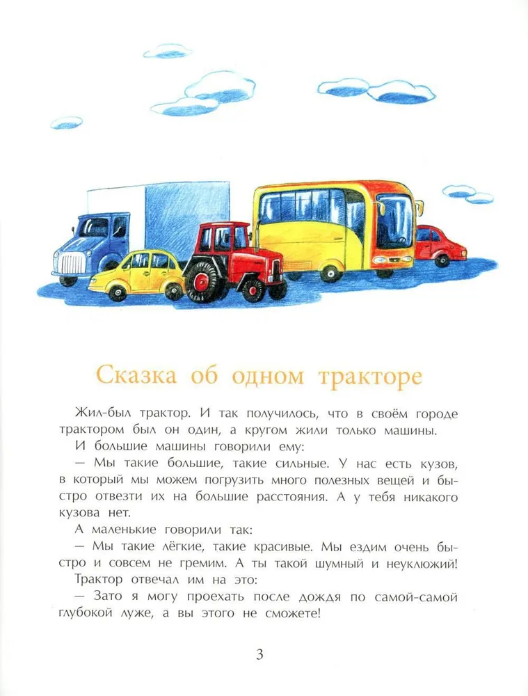 Герои этих сказок – техника. Тракторы, самолёт, грузовичок и даже подводная лодка добросовестно трудятся, выполняют свой долг, попадают в приключения, учатся не делать ошибок, понимать и уважать других. И даже совершают героические поступки.