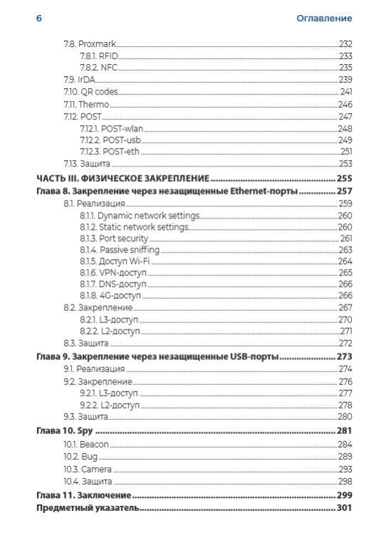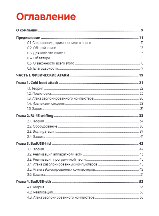 Книга посвящена физическим атакам на беспроводные сети и компьютеры с использованием самодельных хакерских устройств и защите от них. Показан способ дампа памяти компьютера при помощи обычной флешки, метод перехвата сетевого трафика посредством зажимов-"крокодилов". Подробно освещены различные атаки BadUSB, продемонстрирован метод организации несанкционированного доступа к компьютеру при помощи 4G-модема и подключения к локальной сети через хакерское устройство на базе одноплатного компьютера. Описаны атаки на беспроводные сети и уличные IP-камеры с помощью самодельного устройства Wi-Fi Pineapple. Продемонстрирован способ атаки на сеть и устройства с использованием дрона, оборудованного одноплатным компьютером. Описана конструкция защищенного от помех квадрокоптера с управлением по мобильной сотовой сети. Рассказано о том, как превратить обычный мобильный телефон в "трекер" или хакерское устройство, позволяющее управлять гаражными воротами или шлагбаумами.