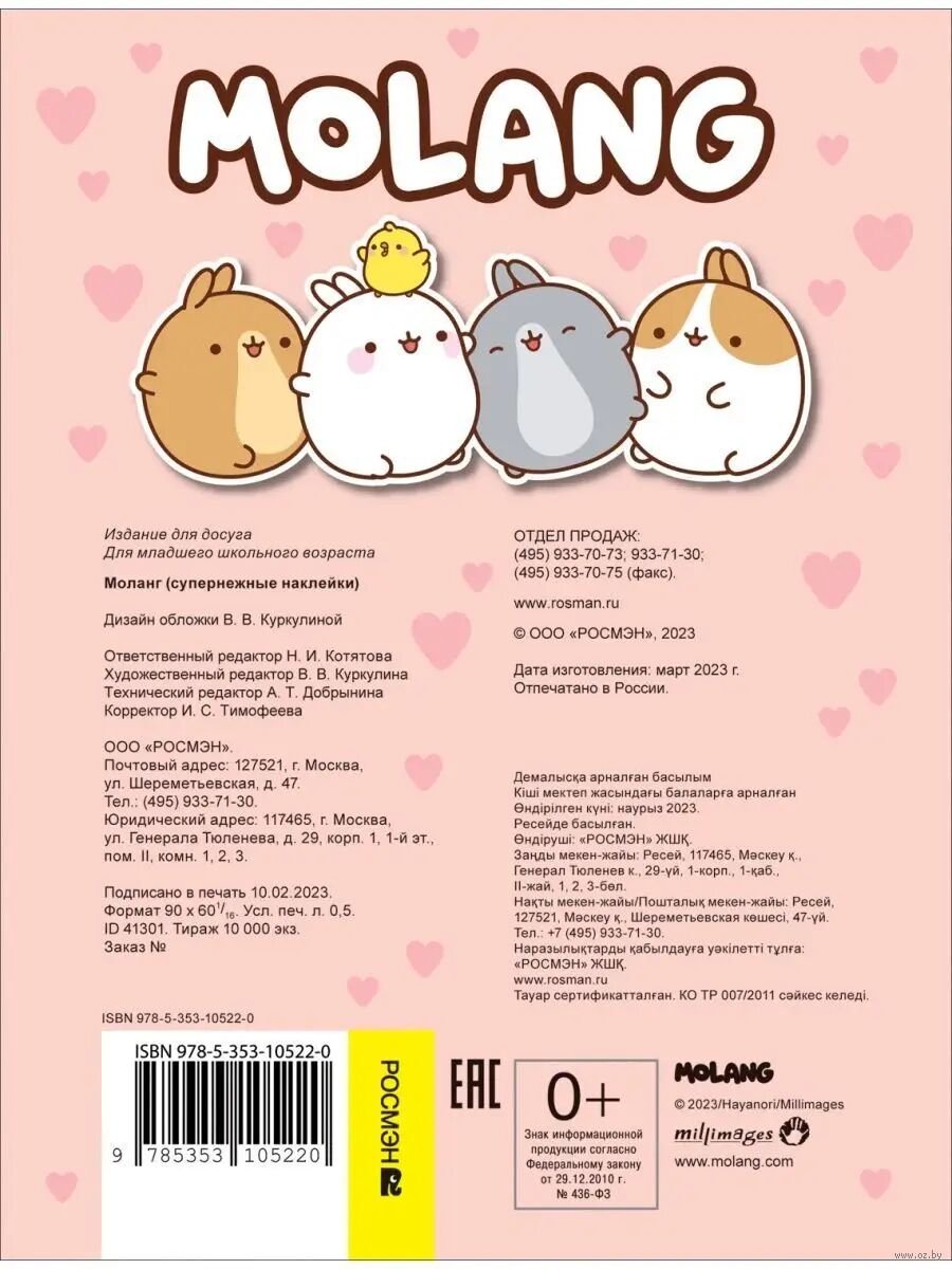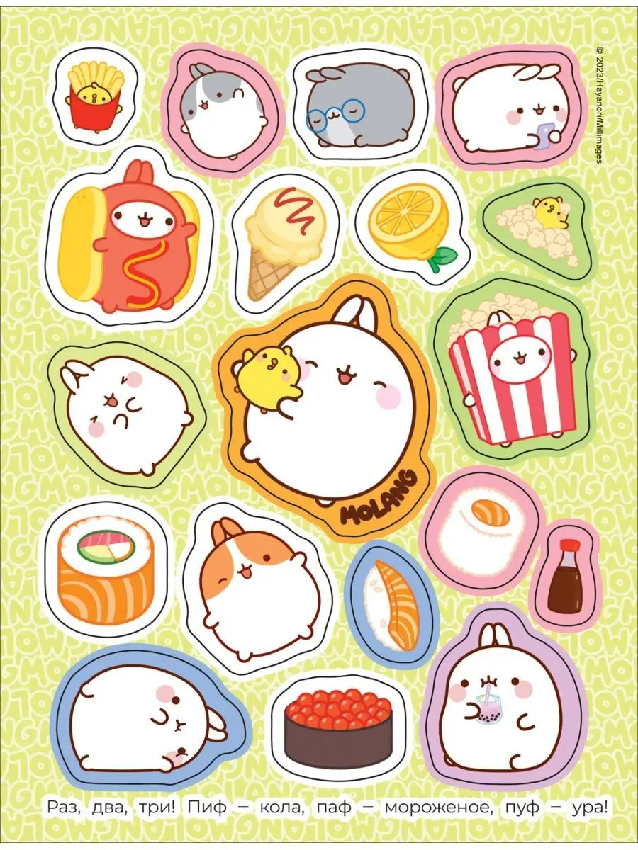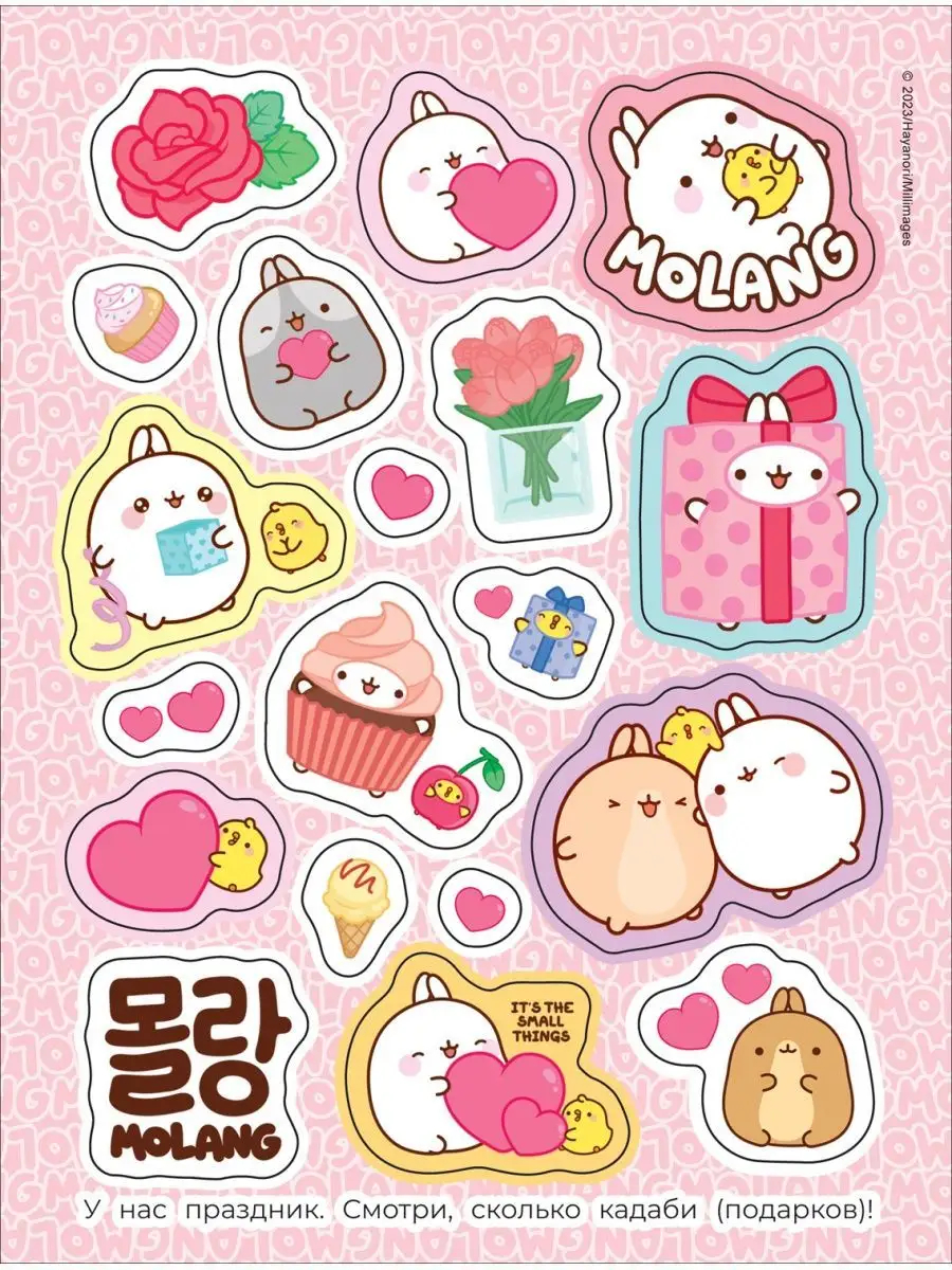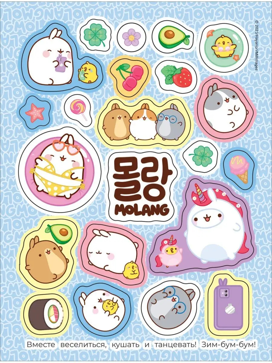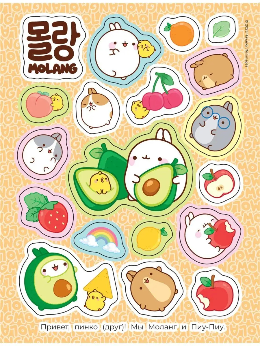Лучшие друзья кролик Моланг и цыпленок Пиу-Пиу не умеют скучать! Каждый день у них наполнен удивительными приключениями и бескрайним весельем. Украшай наклейками тетради, блокноты, телефон, и не только! Милейшие герои помогут создать добрую атмосферу на страницах твоего дневника.