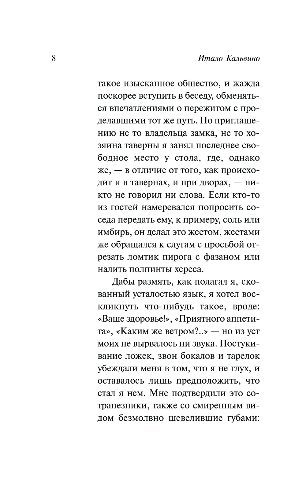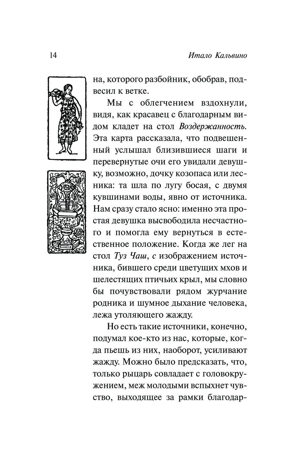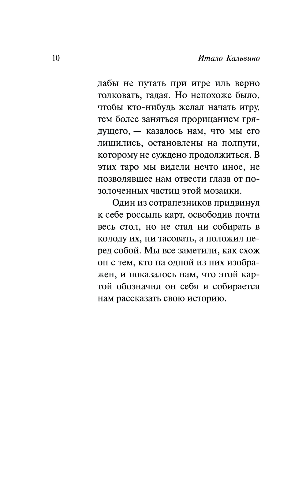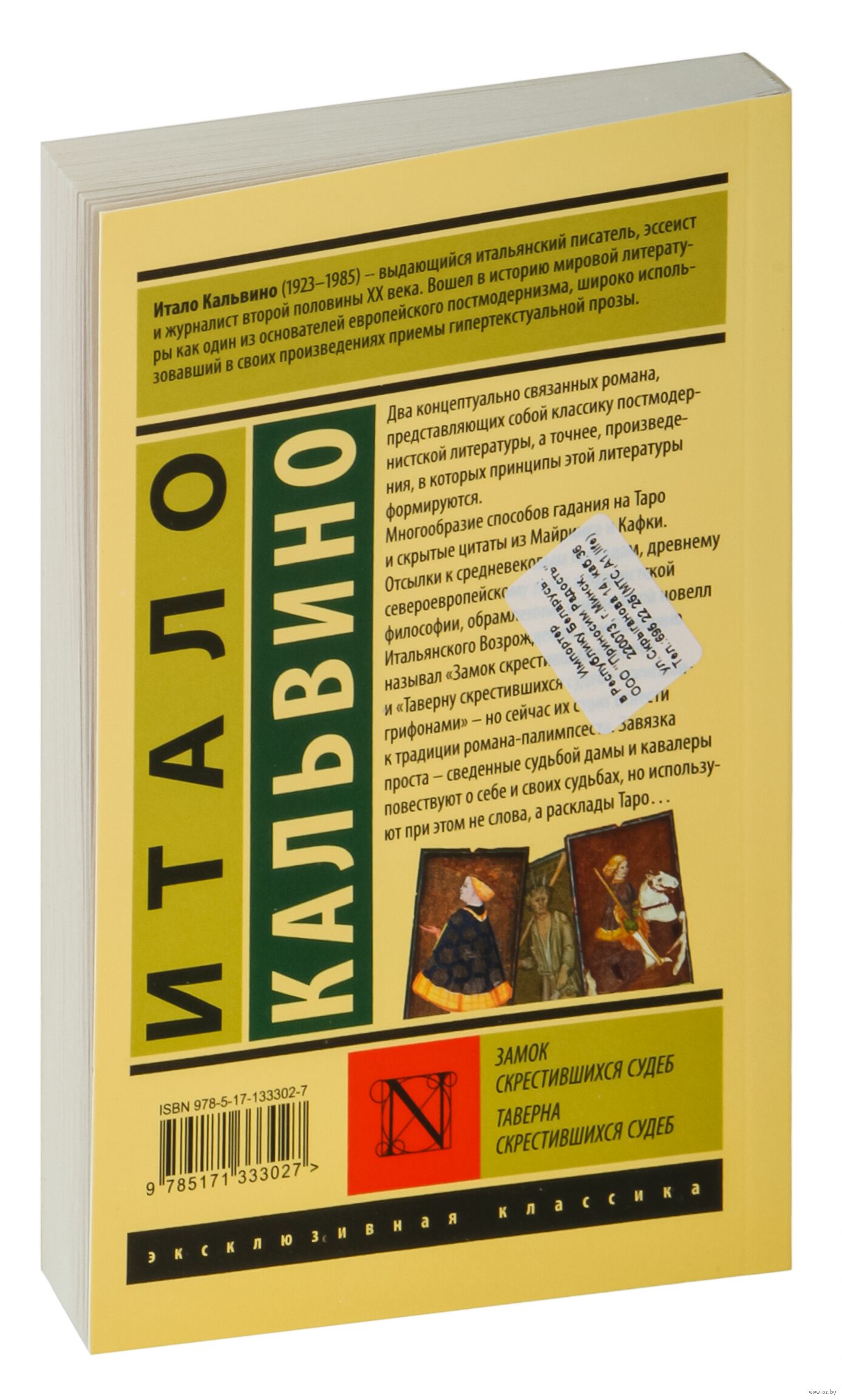 Многообразие способов гадания на Таро и скрытые цитаты из Майринка и Кафки. Отсылки к средневековым легендам, древнему североевропейскому эпосу и буддистской философии, обрамленные стилистикой новелл Итальянского Возрождения. Сам Кальвино называл "Замок скрестившихся судеб" и "Таверну скрестившихся судеб" "книгами-грифонами" – но сейчас их стоит отнести к традиции романа-палимпсеста. Завязка проста – сведенные судьбой дамы и кавалеры повествуют о себе и своих судьбах, но используют при этом не слова, а расклады Таро...