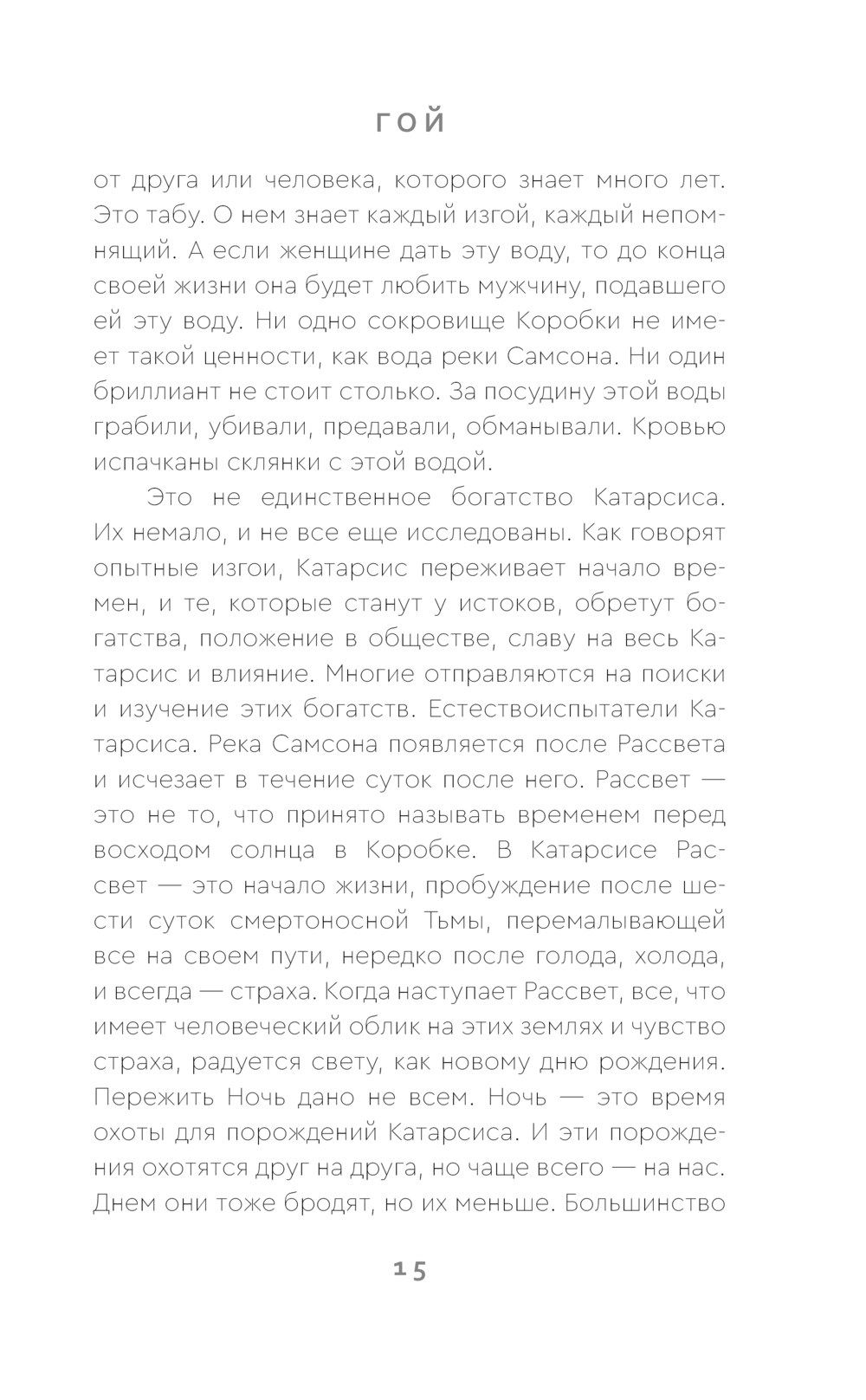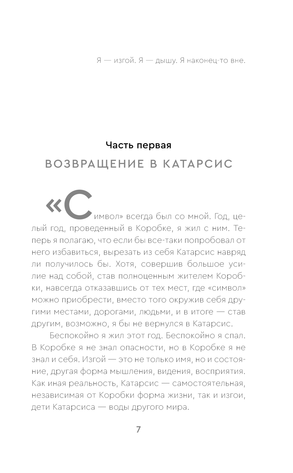 2051 год. Этот мир называют Коробкой, его жителей – изгоями. И однажды изгои находят выход в совершенно иной мир – Катарсис. Там нет роботов, идентичных жителям Коробки, нет "коробок" и вшитых в человеческий мозг компьютеров. Там смерть становится тенью изгоя и преследует его изо дня в день. Там нет привычной ночи – ведь в Катарсисе Ночь длится шесть суток, как и день. Именно Ночью выползают порождения Катарсиса, нелюди, и очищают земли от изгоев. Но Катарсис хранит слишком ценные дары, чтобы изгои могли так просто от него отказаться: вода из реки Самсона подчиняет волю человека, а плод вечности способен оживить умершего человека.