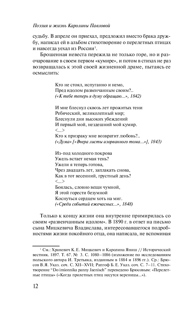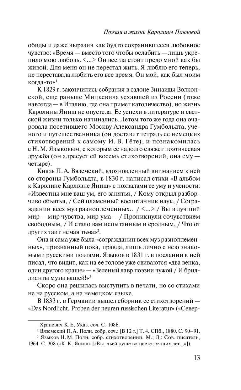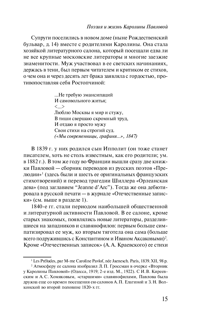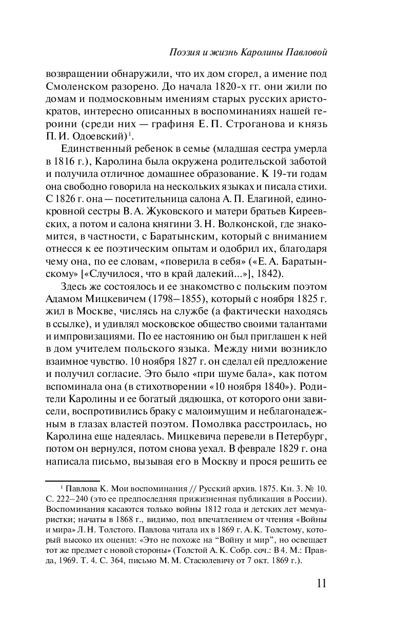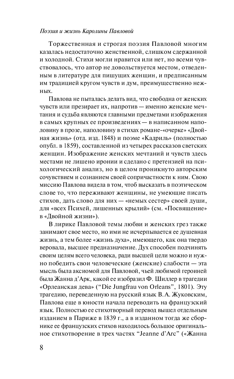 Каролина Павлова прожила почти сто лет – родившись в начале XIX-го века в семье обрусевшего немца, Павлова стала заметной фигурой в литературе той эпохи. Её постоянными собеседниками были лучшие поэты поколения – Пушкин, Баратынский, Языков, Мицкевич. Стихи Павловой, печатавшиеся в известных журналах, нужно воспринимать наравне с сочинениями признанных классиков отечественной поэзии. Энергию её стихотворений, обладающих гипнотизирующей интонацией и необычной образностью, можно сравнить с текстами Эмили Дикинсон – младшей американской современницы Павловой, творившей в затворничестве. Павлова, в отличие от Дикинсон, была известна при жизни, но осталась в тени эпохи, лишь изредка появляясь в посвящениях и письмах более прославленных современников. Нет сомнений, что сейчас настало время заново открывать её творчество.