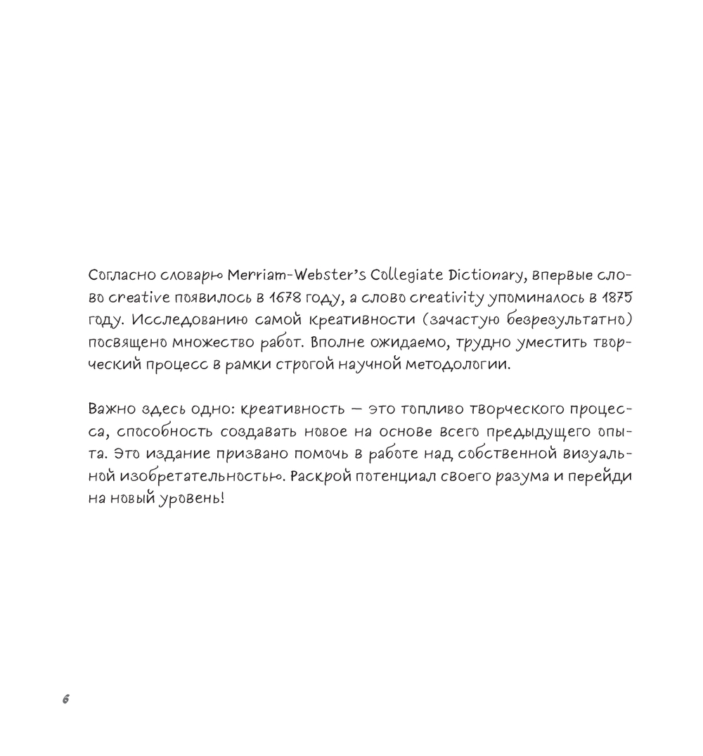 Раскрой свой творческий потенциал и прокачай воображение вместе с этим скетчбуком! Внутри более 40 упражнений для развития креативности, а рисовать можно прямо в этой книге. Отдельный скетчбук не понадобится. Эта книга поможет начинающим художникам преодолеть страх чистого листа и создать свои первые работы, а профессионалам – весело провести время и найти новые нестандартные идеи. Она подойдет для каждого творческого человека, увлеченного рисованием, который устал от рутины и хочет найти новые подходы к стандартным задачам и развить фантазию.