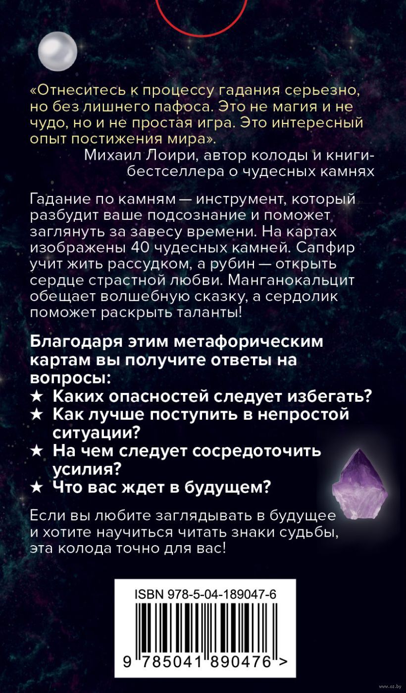 "Чудесные камни. Метафорические карты для поиска верного пути" – новинка от коллекционера Михаила Лоири, автора бестселлера "Чудесные камни. 250 минералов: история, свойства, скрытые особенности". Эта колода собрала 40 самых лучших минералов из коллекции автора, которые обладают настоящей магической силой. Метафорические карты с изображением камней ответят на самые сокровенные вопросы о личной жизни, внесут ясность в случае неразрешимых проблем, предостерегут от трудностей и укажут верный путь. Гадание по камням, или литопрогноз, помогает разбудить подсознание человека, чтобы он смог услышать советы старших товарищей, которые существуют на земле миллионы лет. Дополнительная информация в конце колоды станет подтверждением мудрости каждого камня, ведь благодаря интересным фактам в приложении вы сможете узнать, какие легенды слагались о минералах и почему именно к их прогнозам стоит прислушаться.