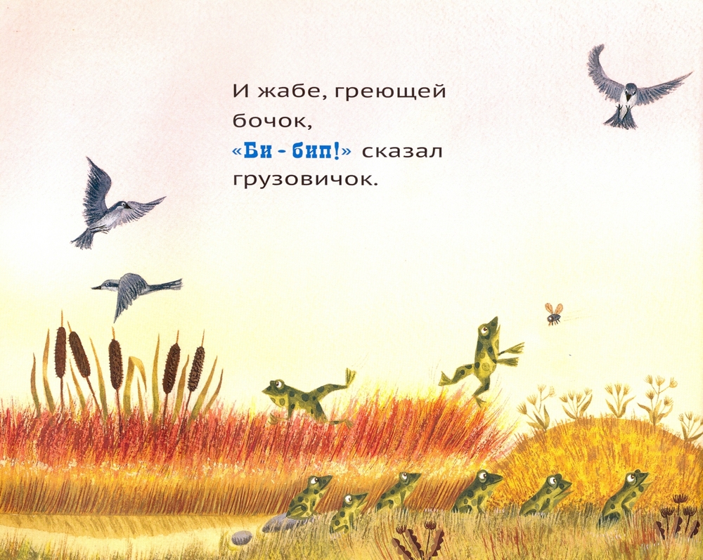 Напоминающие фольклорные мотивы строки стихотворения знакомят читателей с Голубым грузовичком и обитателями скотного двора, которых он встречает, пока едет по проселочным дорогам мимо своего сельского дома. Первая половина книги – очаровательная, приводящая в оцепенение симфония сигналов машины и звуков животных. Веселый текст имитирует прыгающий грузовик, а теплые иллюстрации в народном стиле дополняют картину. Начинается дождь, и в историю вступает подлый, напыщенный самосвал. Когда же самосвал попал в грязь и сигналит о помощи, никто его не слышит. Голубой грузовичок хочет помочь, но тоже застревает. И когда он кричит о помощи, животные бегут ему на выручку. Так самосвал узнает, что: