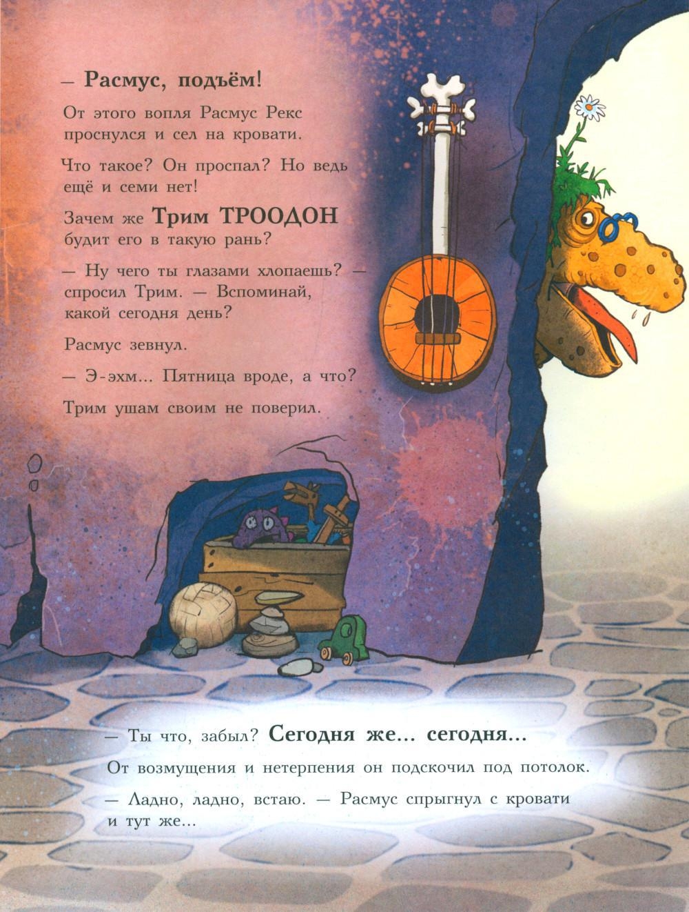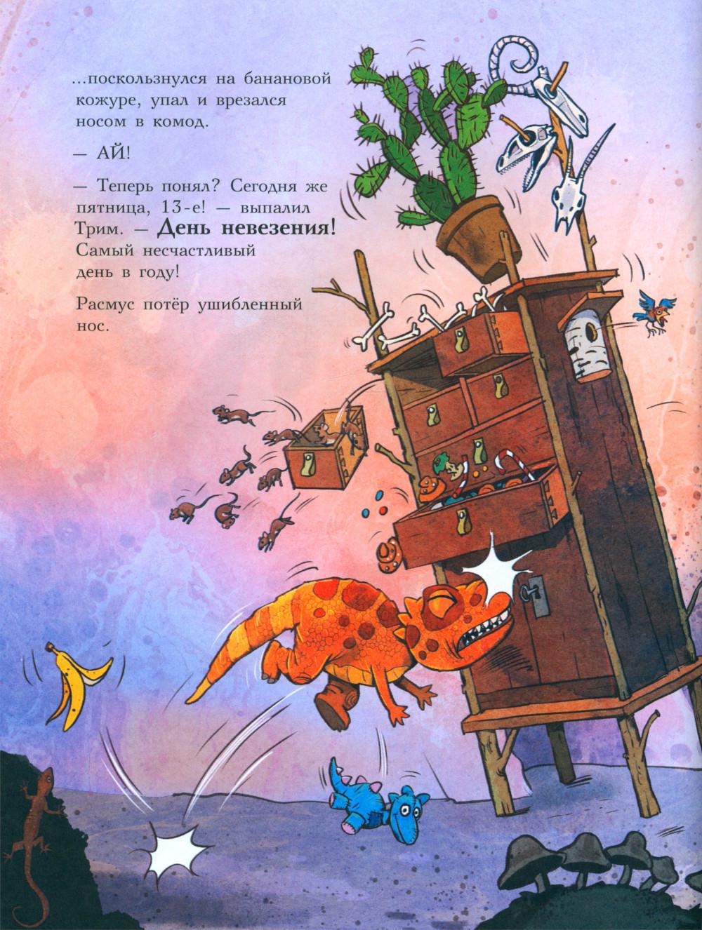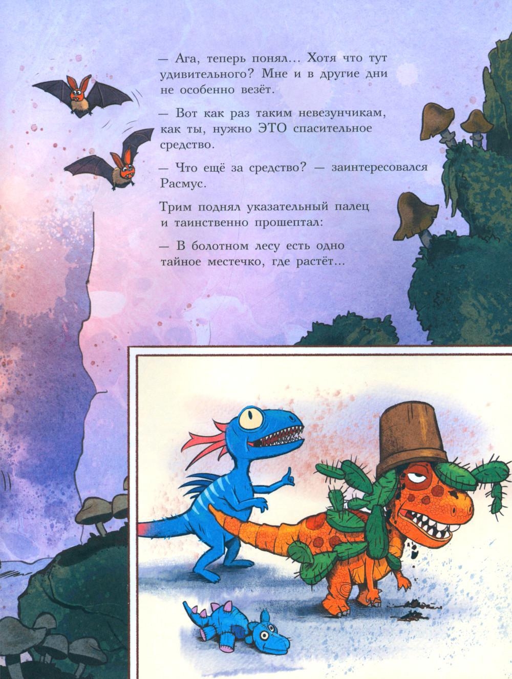 Ни свет ни заря Расмуса Рекса разбудил его лучший друг Трим Троодон. Не успел Расмус встать с кровати, как поскользнулся, упал и врезался носом в комод. А всего через пару минут под ним проломилась половица, и он свалился в подвал. Почему же день не задался с утра? Да потому, что сегодня пятница, 13-е – день невезения! Но Трим знает способ, как избавиться от всех несчастий. Надо найти клевер-четырёхлистник, закрыть глаза, загадать желание, бросить клевер через левое плечо, и – опля! – желание сбудется! Правда, растёт этот ключик к удаче в самой чаще болотного леса, на лугу под Голубой горой. Друзья берут у папы Рекса лодку и отправляются за клевером по реке, даже не представляя, сколько опасностей их ждёт впереди...