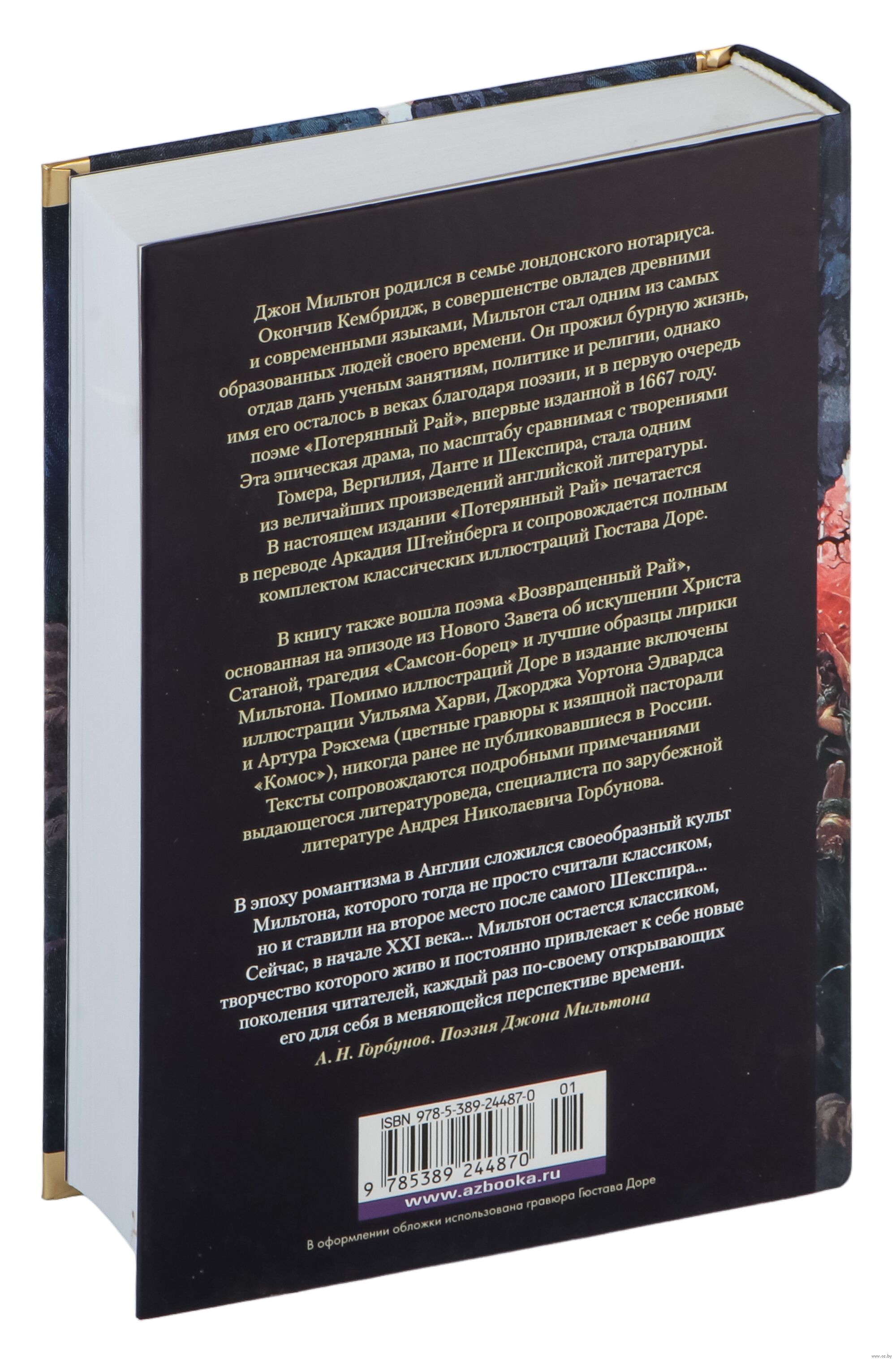 В книгу также вошла поэма "Возвращенный Рай", основанная на эпизоде из Нового Завета об искушении Христа Сатаной, трагедия "Самсон-борец" и лучшие образцы лирики Мильтона. Помимо иллюстраций Доре в издание включены иллюстрации Уильяма Харви, Джорджа Уортона Эдвардса и Артура Рэкхема (цветные гравюры к изящной пасторали "Комос"), никогда ранее не публиковавшиеся в России. Тексты сопровождаются подробными примечаниями выдающегося литературоведа, специалиста по зарубежной литературе Андрея Николаевича Горбунова.