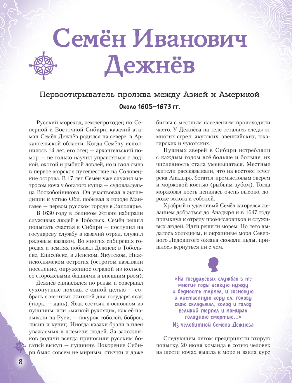 Эта книга патриотической серии "Великие люди великой страны" рассказывает о двадцати знаменитых путешественниках и первооткрывателях, чьи имена навсегда останутся в истории России. Кто был капитаном первого русского корабля, совершившего кругосветное плавание? Кому посчастливилось обнаружить древний мёртвый город? Кого называют русским Колумбом ХХ века? Кто открыл Антарктиду?