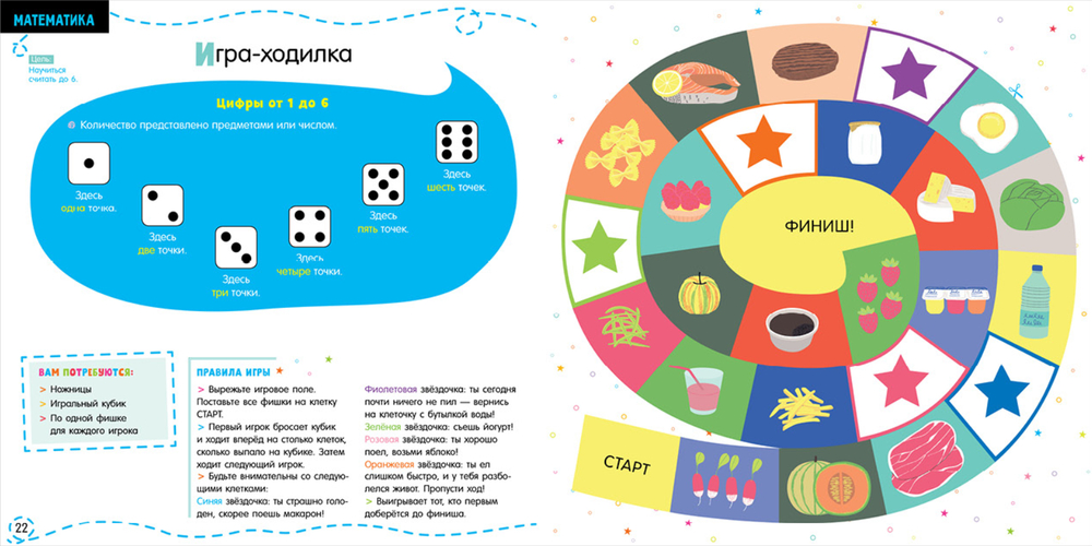 Вас ждет много классных игр, в которые можно играть снова и снова. Кроме того, эту легкую тетрадь можно взять с собой в гости или в поездку, прихватив из дома фишки и игральный кубик.