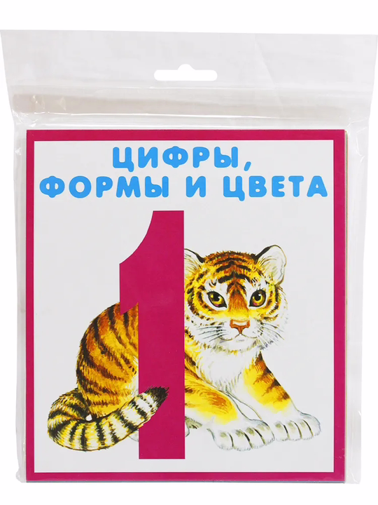 В набор входят 20 карточек, выполненных из плотного белого картона. Ребенок выучит цифры, научится считать от 1 до 10, познакомится с геометрическими фигурами, а также узнает основные цвета.