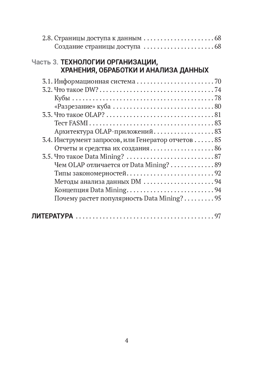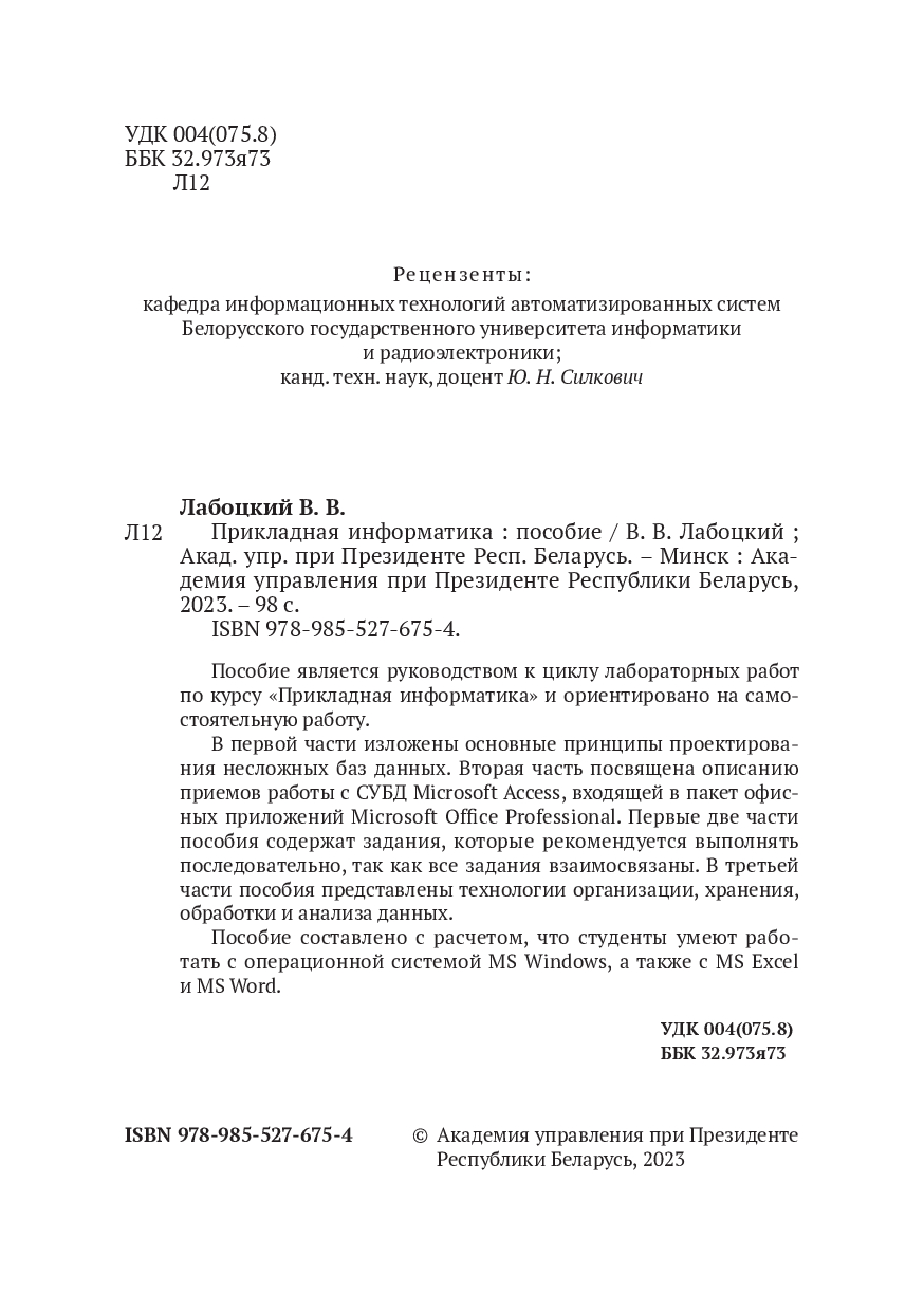 Пособие является руководством к циклу лабораторных работ по курсу "Прикладная информатика" и ориентировано на самостоятельную работу. В первой части изложены основные принципы проектирования несложных баз данных. Вторая часть посвящена описанию приемов работы с СУБД Microsoft Access, входящей в пакет офисных приложений Microsoft Office Professional. Первые две части пособия содержат задания, которые рекомендуется выполнять последовательно, так как все задания взаимосвязаны. В третьей части пособия представлены технологии организации, хранения, обработки и анализа данных. Пособие составлено с расчетом, что студенты умеют работать с операционной системой MS Windows, а также с MS Excel и MS Word.
