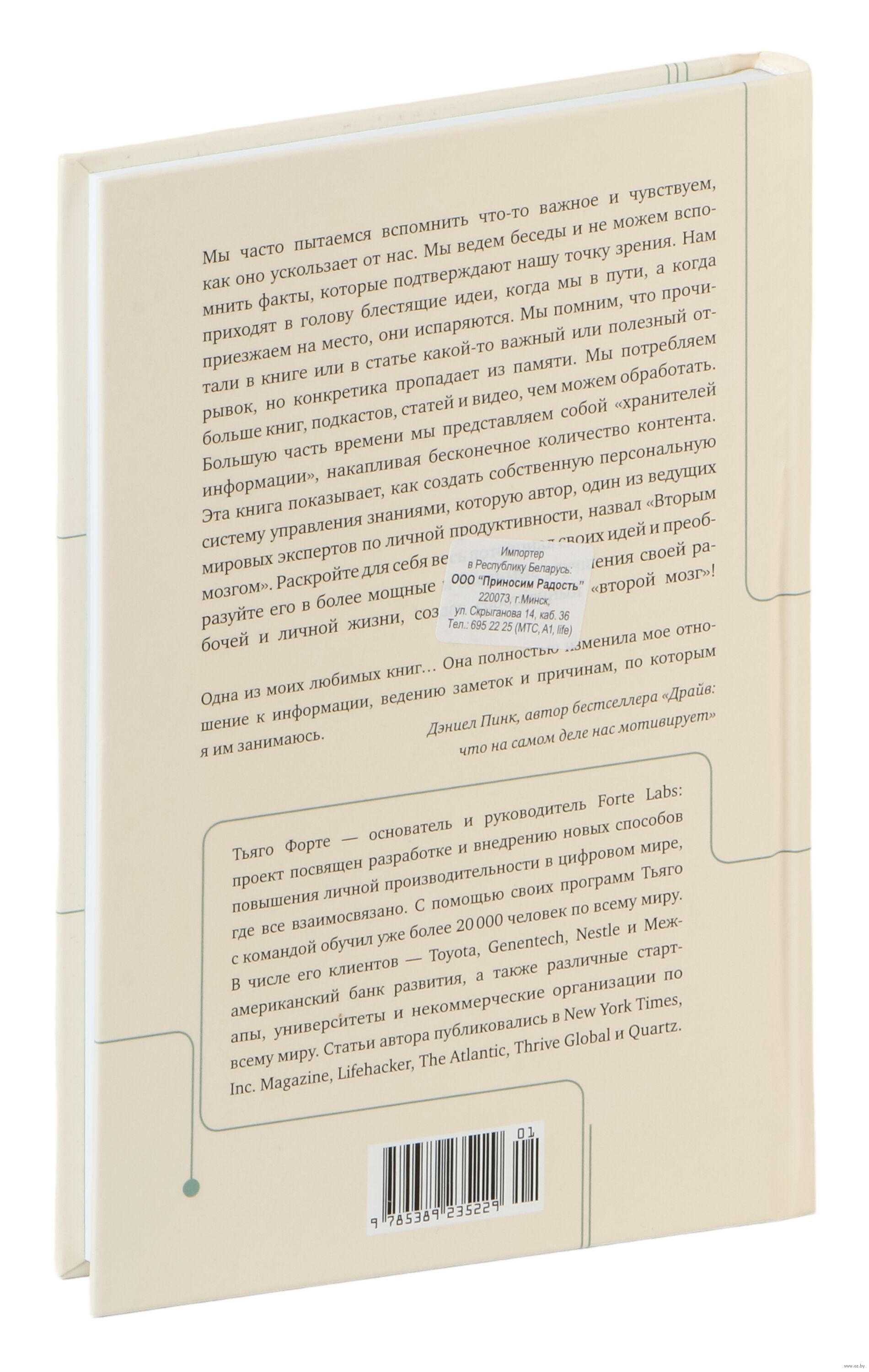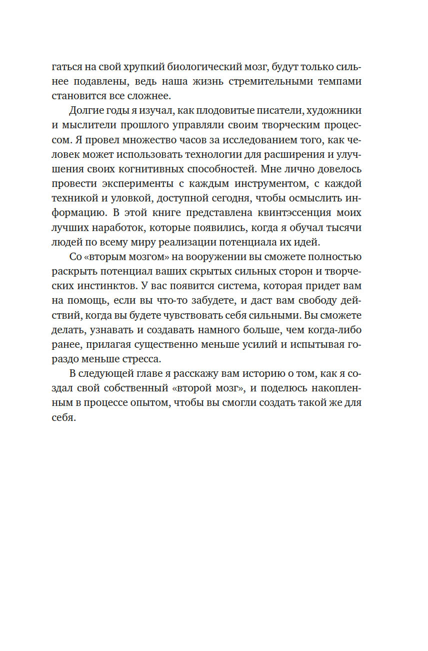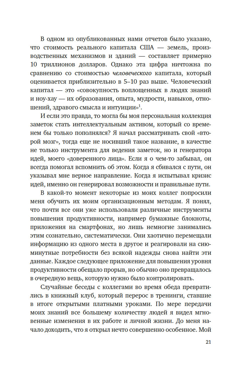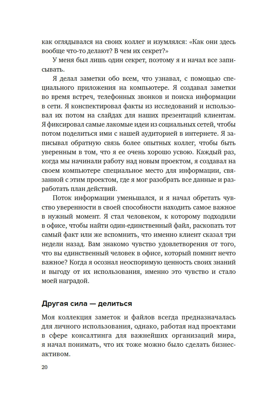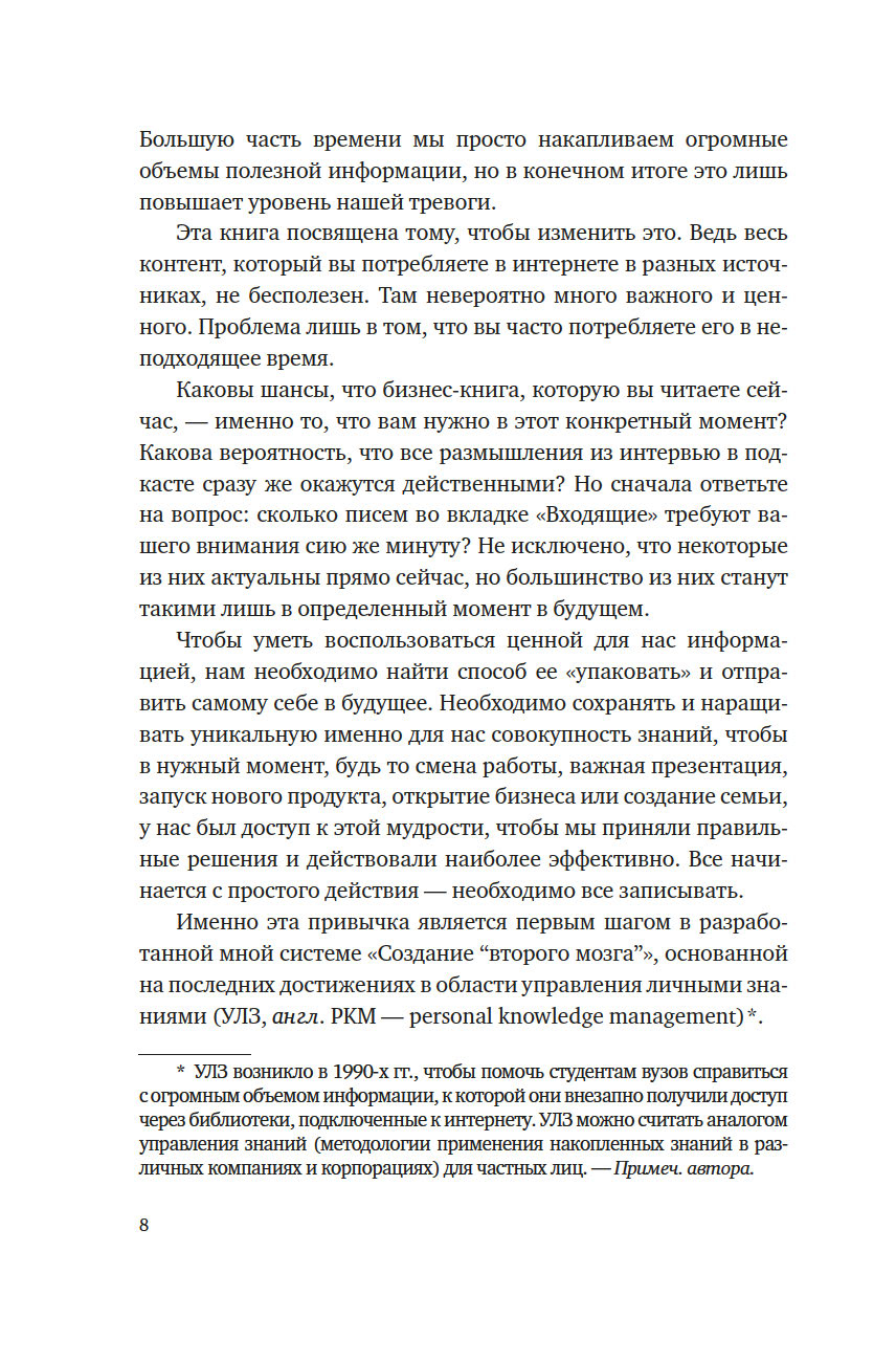 В своей книге, ставшей бестселлером, Тьяго Форте рассказывает о системе, которая позволяет упорядочить поиск и хранение информации, чтобы получать доступ к знаниям именно тогда, когда мы нуждаемся в них больше всего – в работе, в ведении бизнеса и управлении своей жизнью. Надежное и хорошо организованное цифровое хранилище ваших самых ценных идей, заметок и творческих начинаний, синхронизированных на всех ваших устройствах и платформах, придаст вам уверенности в работе над важнейшими проектами и достижении самых амбициозных целей.
