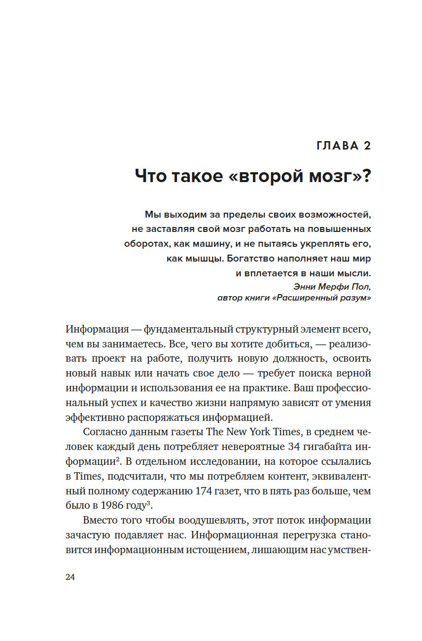В наши дни объемы потребления информации значительно возросли. Мы ежедневно потребляем в среднем в 5 раз больше информации, чем 40 лет назад. Существенную часть рабочего времени офисные сотрудники тратят на поиск и систематизацию данных, разбросанных по различным каналам, и лишь примерно в половине случаев находят то, что искали. Причина проста – человеческий разум столкнулся с вызовами, неведомыми нашим предкам. Информации становится больше, но найти ей наиболее эффективное применение становится все труднее. Собирая полезные статьи и делая заметки, зачастую мы просто складируем их, не извлекая всей пользы, – при этом проблема кроется не в самой информации, а в том, что мы потребляем ее в неподходящее время.