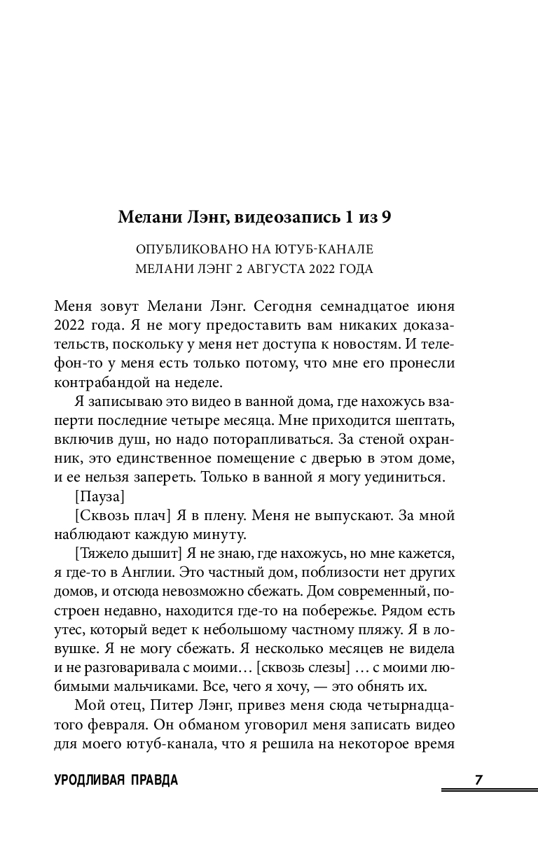 Только бывший муж и помощница Мелани уверены – ее похитили и удерживают против воли. Их обеспокоенность разделяют сотни фанатов Мелани и СМИ. Ситуация накаляется еще сильнее, когда в Сети появляются видео, снятые девушкой в заточении. Она утверждает, что ее держит в плену собственный отец. И это далеко не самая страшная вещь, которая происходит за закрытыми дверями семейства Лэнг...