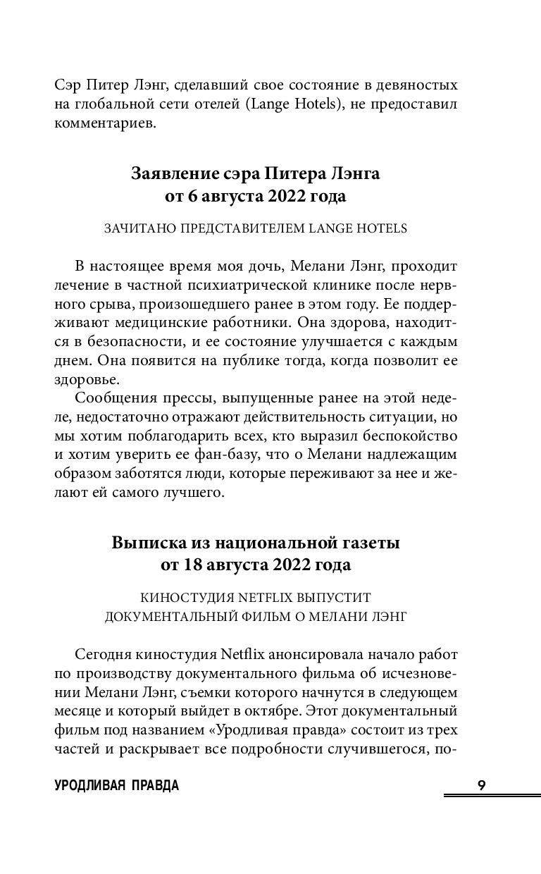 Мелани Лэнг исчезла. Бывшая модель и бизнес-леди просто пропала с радаров папарацци и социальных сетей. Ее отец, бизнесмен и миллионер, сэр Питер Лэнг утверждает, что она представляет опасность для себя самой и поэтому была помещена в специальное место.