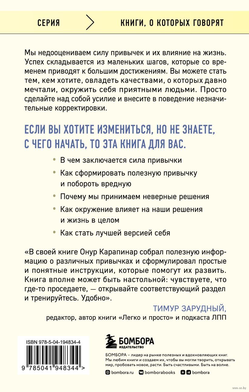 Всё начинается с наших привычек. После нескольких лет исследований автор и успешный предприниматель Онур Карапинар объясняет, как создание небольших привычек позволит добиться больших успехов в долгосрочной перспективе. Всего несколько минут в день позволят вырваться из замкнутого круга и перенаправить свою энергию в нужное русло.