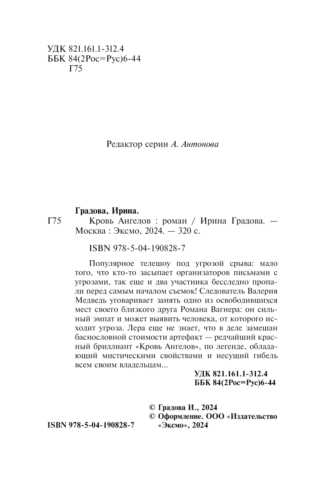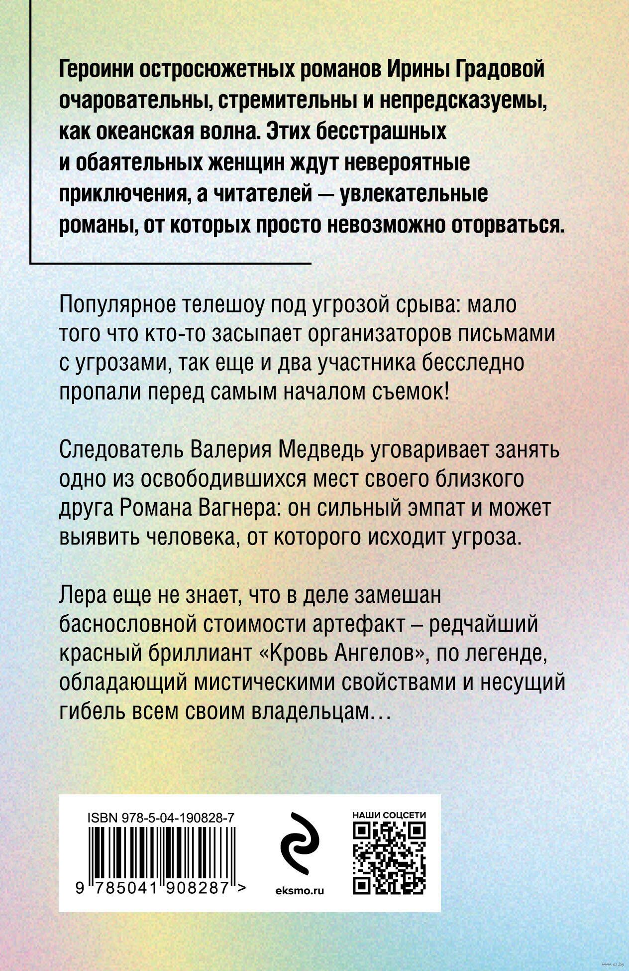 Популярное телешоу под угрозой срыва: мало того, что кто-то засыпает организаторов письмами с угрозами, так еще и два участника бесследно пропали перед самым началом съемок! Следователь Валерия Медведь уговаривает занять одно из освободившихся мест своего близкого друга Романа Вагнера: он сильный эмпат и может выявить человека, от которого исходит угроза. Лера еще не знает, что в деле замешан баснословной стоимости артефакт – редчайший красный бриллиант "Кровь Ангелов", по легенде, обладающий мистическими свойствами и несущий гибель всем своим владельцам...