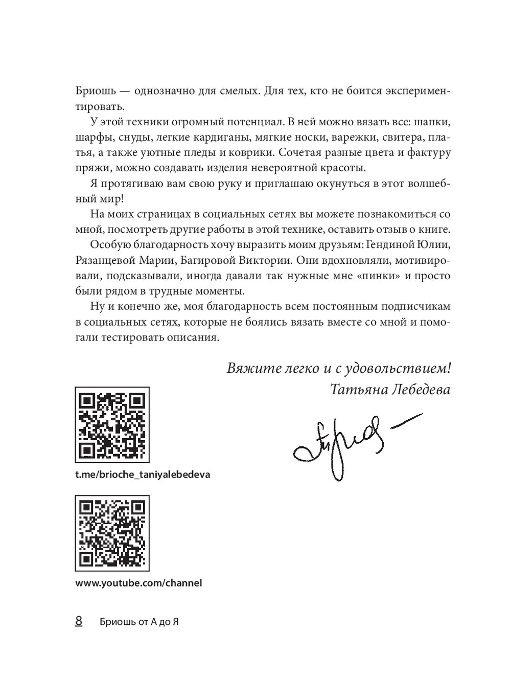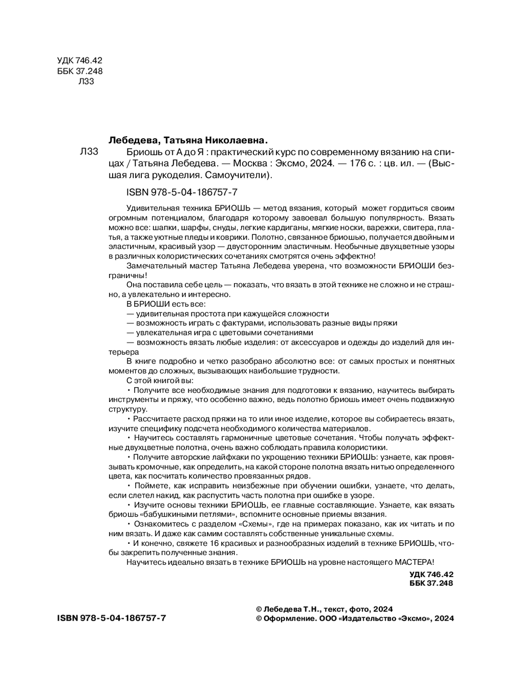 "Бриошь – это самая загадочная техника вязания. Она завораживает своей необычностью и пугает своей сложностью. Эта техника для смелых, для тех, кто не боится экспериментировать. У нее огромный потенциал!". Так считает автор этой книги, замечательный мастер Татьяна Лебедева., которая с удовольствием приглашает читателя в увлекательное вязальное путешествие!
