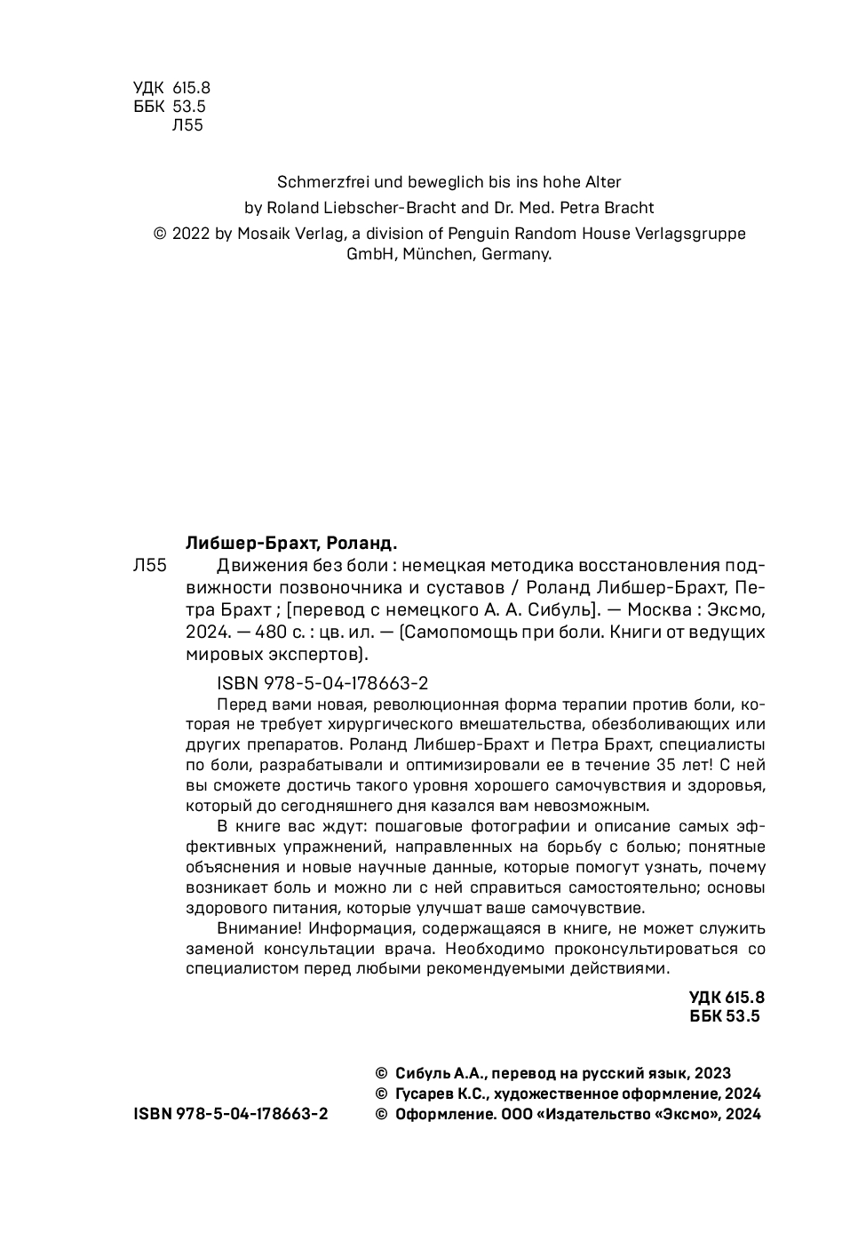 | Название в оригинале | Schmerzfrei und beweglich bis ins hohe Alter: Das große Selbsthilfe-Buch nach der Liebscher & Bracht-Methode – Das Übungsprogramm für den ganzen Körpe |