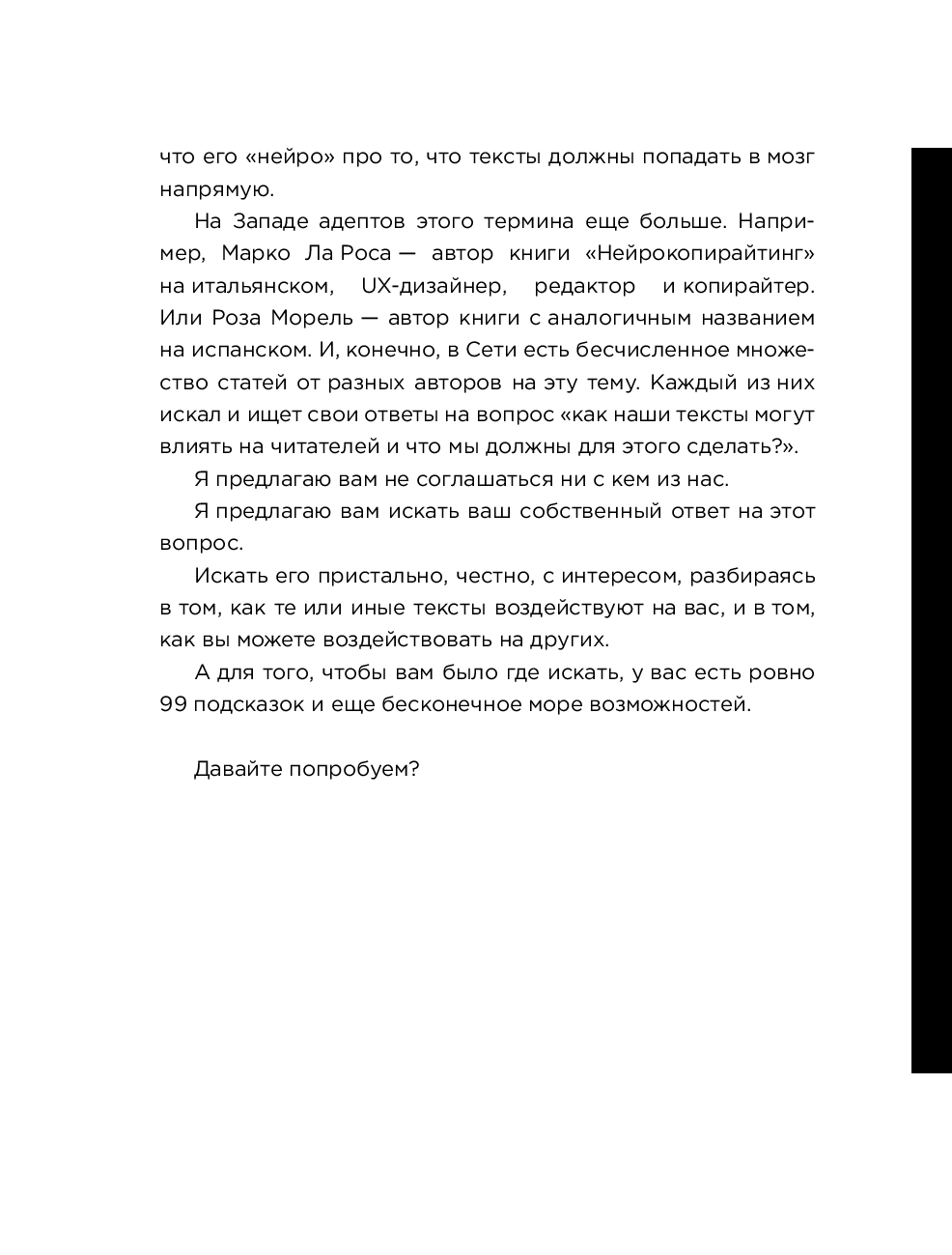 В этой книге собраны 99 самых эффективных приемов текстового влияния. Как сделать так, чтобы ваши посты продавали, письма убеждали, лонгриды увлекали, а статьи попадали в самое сердце – объясняет один из самых опытных копирайтеров России Майя Богданова. В основе предлагаемых ею приемов лежат принципы психологии влияния, НЛП-техники, наработки известных копирайтеров и другие способы воздействия на сознание читателя. Каждая из глав посвящена одному инструменту текстового влияния. Поэтому их можно читать в любом порядке, как подряд, так и исходя из конкретной задачи, требующей быстрого решения.