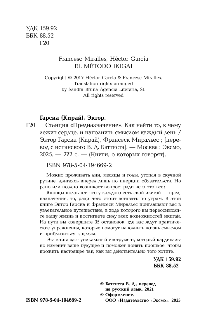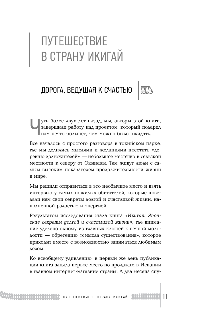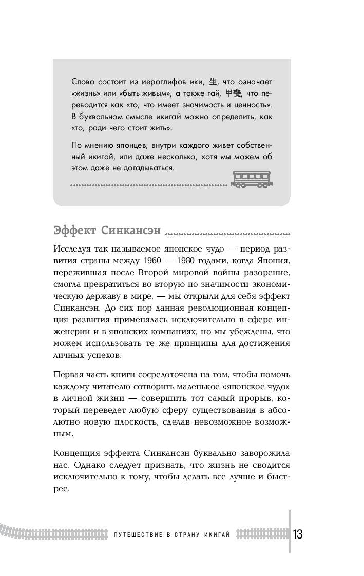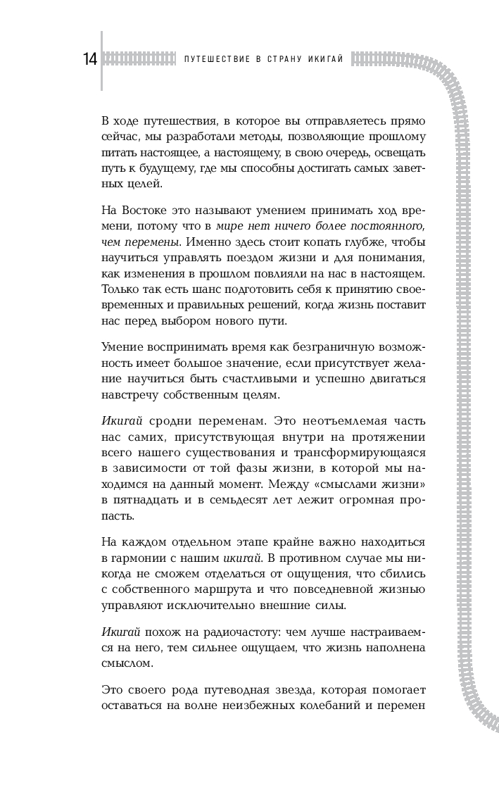 Японцы полагают, что у каждого есть свой икигай – предназначение, то, ради чего стоит вставать по утрам. В этой книге Эктор Гарсиа и Франсеск Миральес приглашают вас в увлекательное путешествие, в ходе которого вы переосмыслите вашу жизнь и постигнете силу всех возможностей икигай. На пути вы совершите 35 остановок, где вас ждут практические упражнения, которые помогут наполнить жизнь смыслом и приблизиться к целям.
