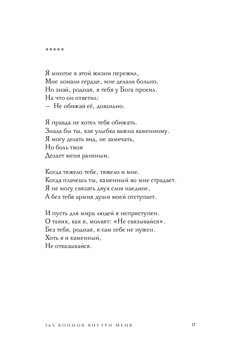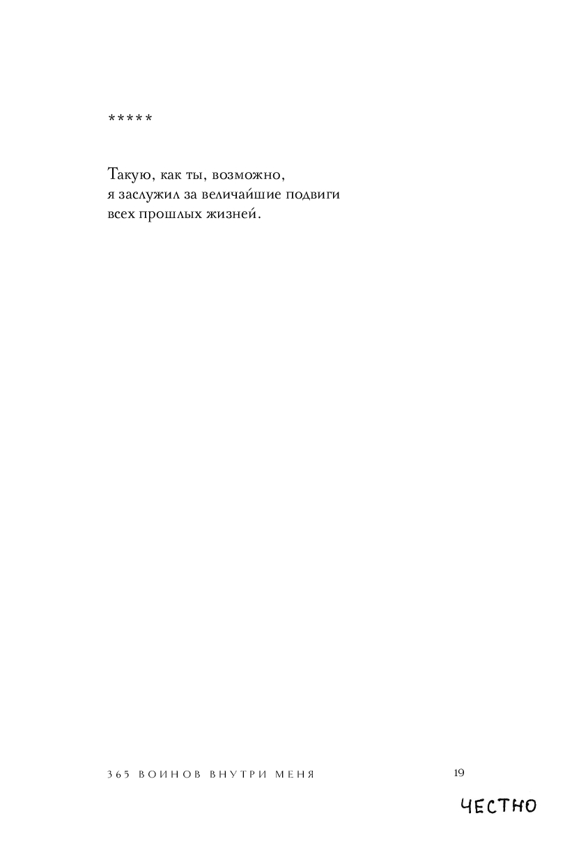 Человек, проживая каждый день, сам того не ведая, ведет борьбу внутри себя: со своими чувствами, мыслями, страхами и сердцем. Каждый день – это один воин. В этом сборнике вы найдете 365 стихов – 365 воинов, надежду, любовь, честь и право быть собой, быть женщиной.