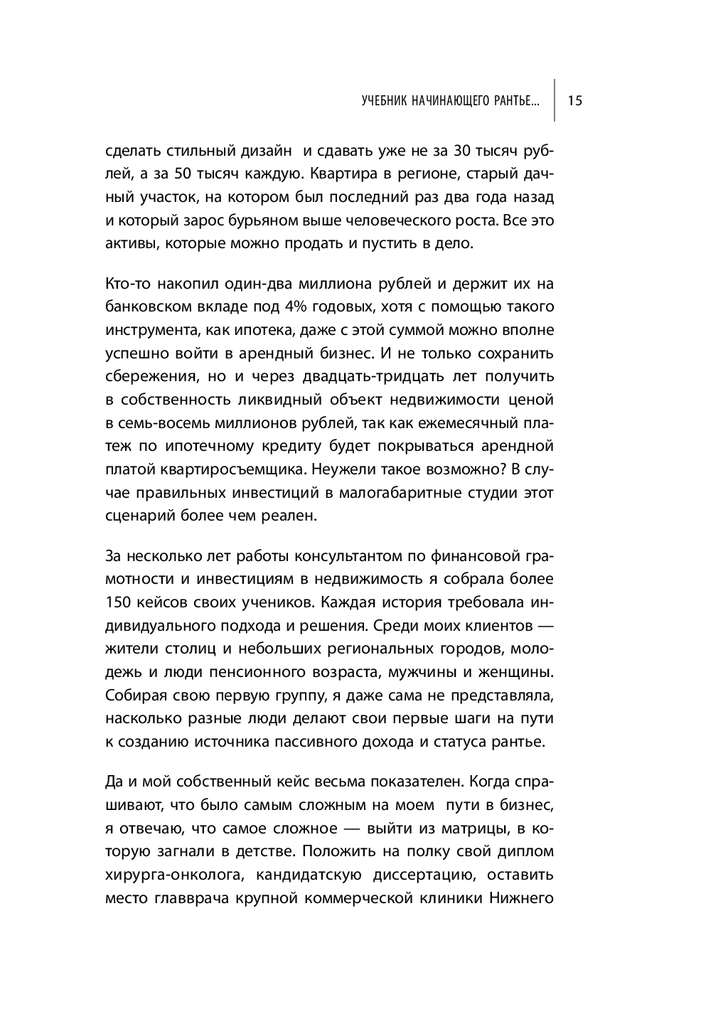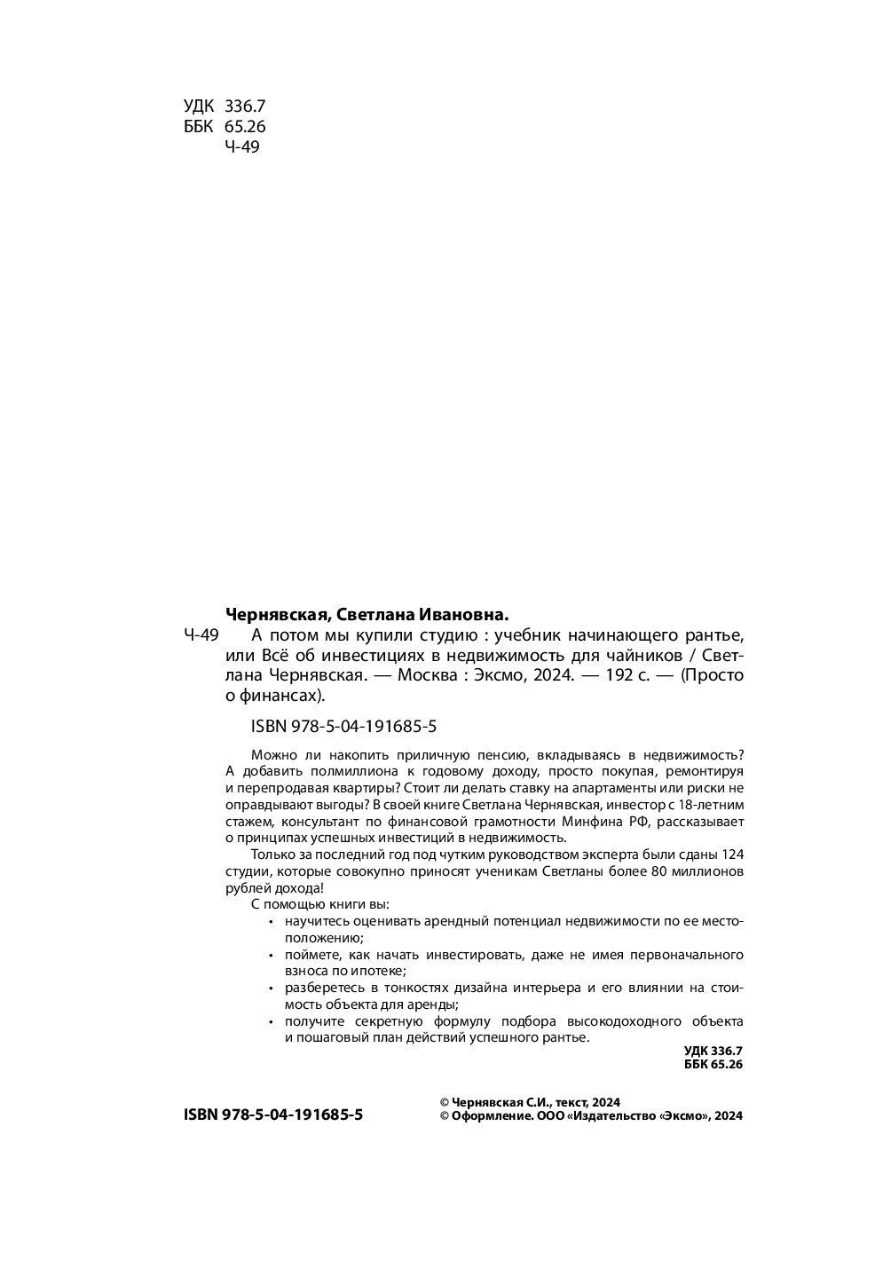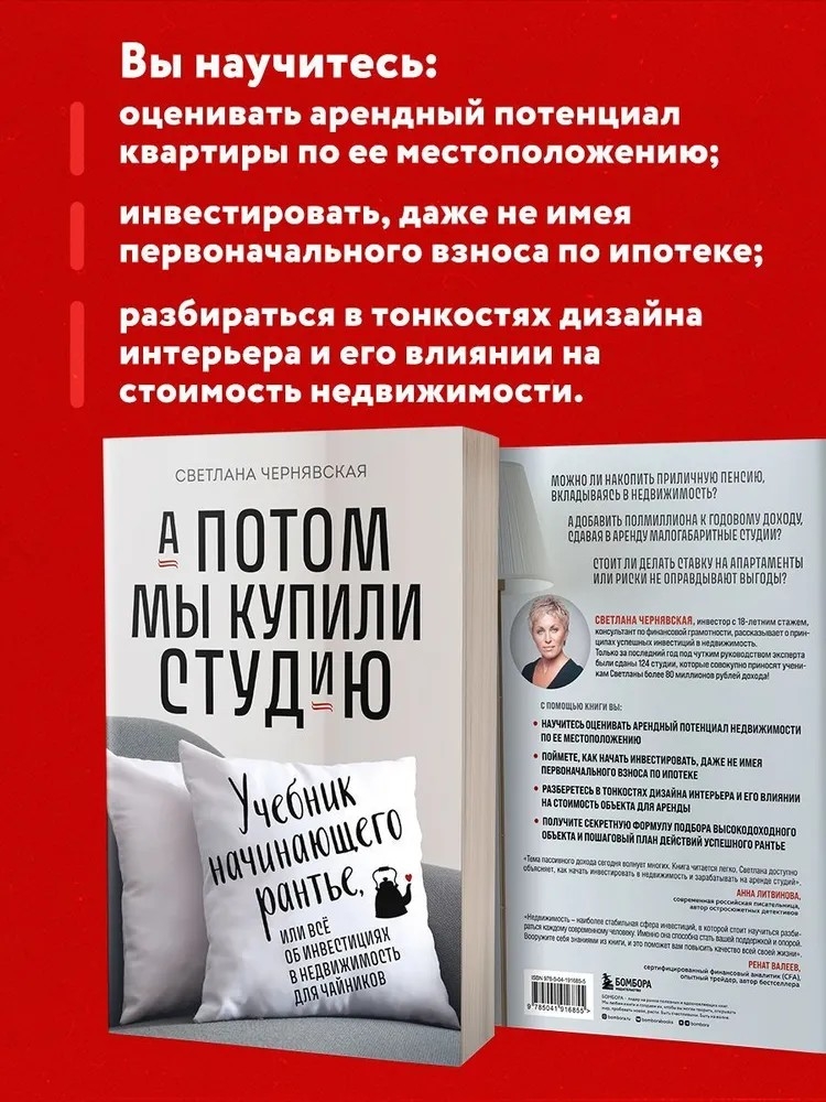 Можно ли накопить приличную пенсию, вкладываясь в недвижимость? А добавить полмиллиона к годовому доходу, просто покупая, ремонтируя и перепродавая квартиры? Стоит ли делать ставку на апартаменты или риски не оправдывают выгоды? В своей книге Светлана Чернявская, инвестор с 18-летним стажем, консультант по финансовой грамотности Минфина РФ, рассказывает о принципах успешных инвестиций в недвижимость.