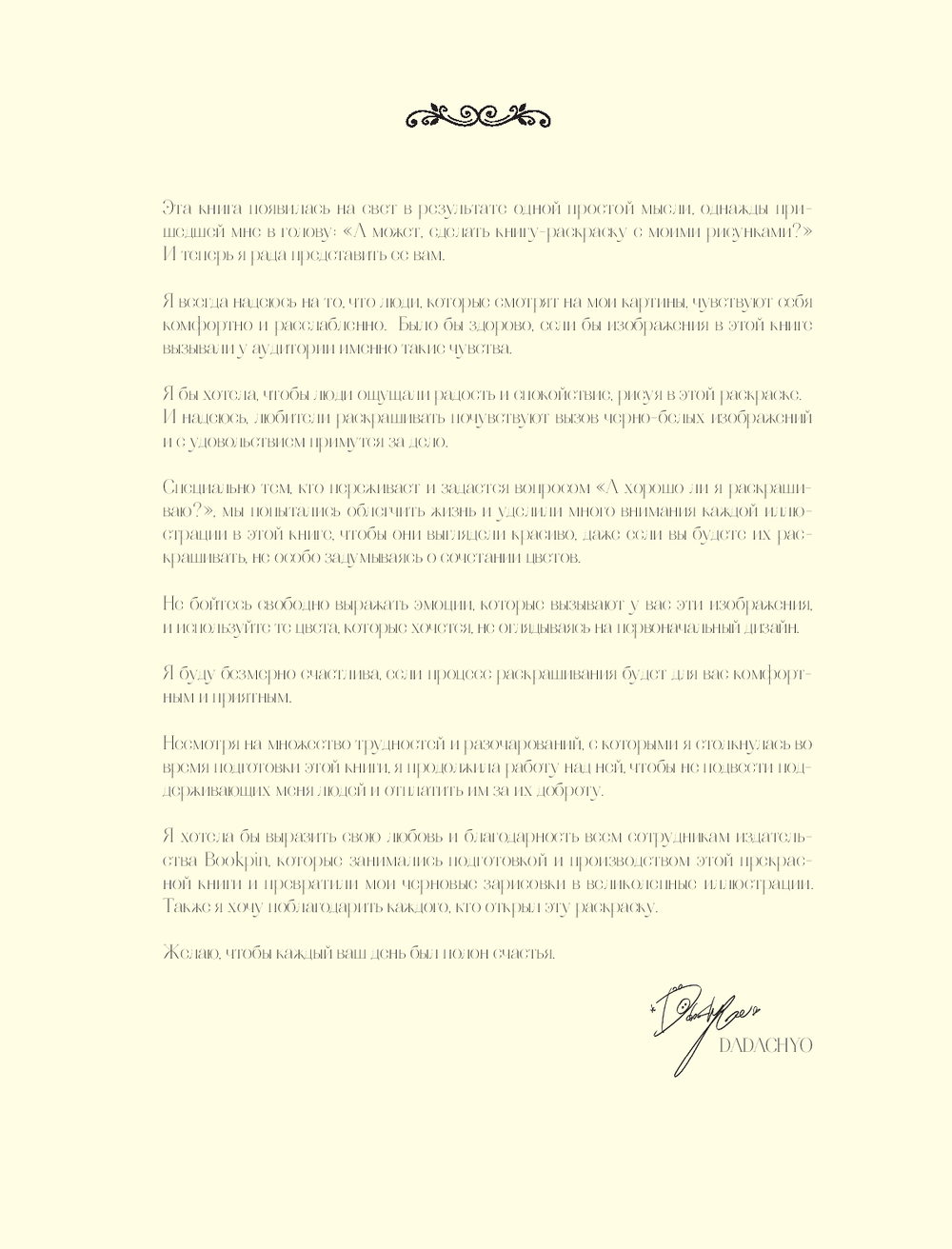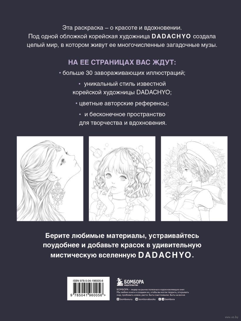 Эта раскраска – о красоте и вдохновении. Под одной обложкой корейская художница DADACHYO собрала больше 30 иллюстраций, на которых изображены ее многочисленные музы. Вместе с этой антистресс-раскраской вы погрузитесь в волшебный мир прекрасных девушек и сможете проявить весь свой творческий потенциал. Берите любимые материалы, устраивайтесь поудобнее и добавьте красок в удивительную вселенную DADACHYO.