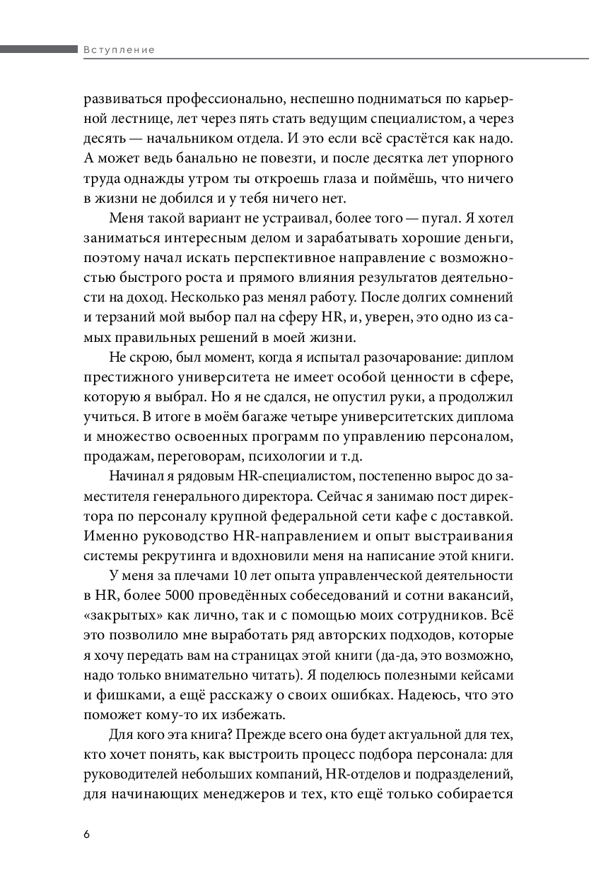 Книга представляет собой практическое руководство по рекрутингу на разных этапах: от разработки требований к кандидату и до процессов онбординга. Пошаговая инструкция основана на профессиональном опыте Сергея Журавлёва, hr-специалиста с 10-летним опытом работы в сфере управления кадров.