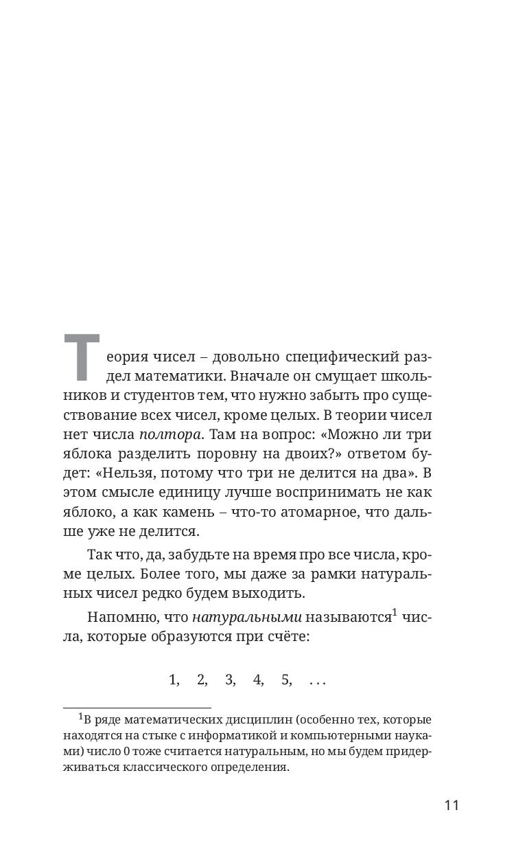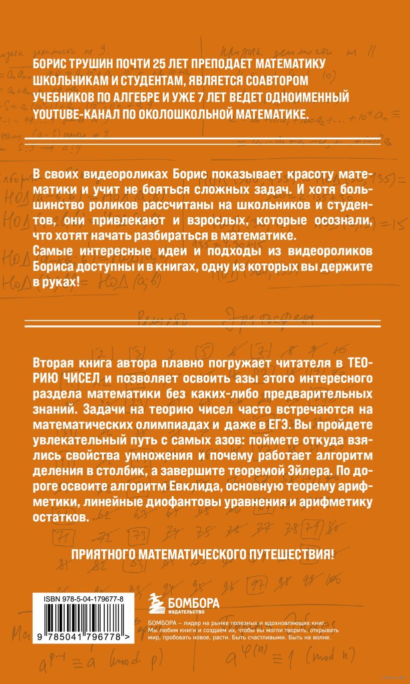 Вторая книга автора плавно погружает читателя в теорию чисел, и позволяет освоить азы этого интересного раздела математики без каких-либо предварительных знаний. Задачи на теорию чисел часто встречаются на математических олимпиадах, и в ЕГЭ. Вы пройдете увлекательный путь: с самых азов – поймете откуда взялись свойства умножения, и почему работает алгоритм деления в столбик, а закончите теоремой Эйлера.