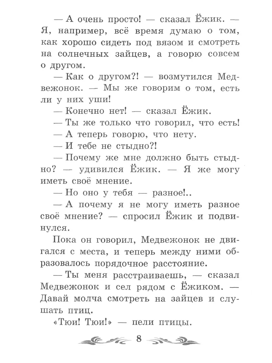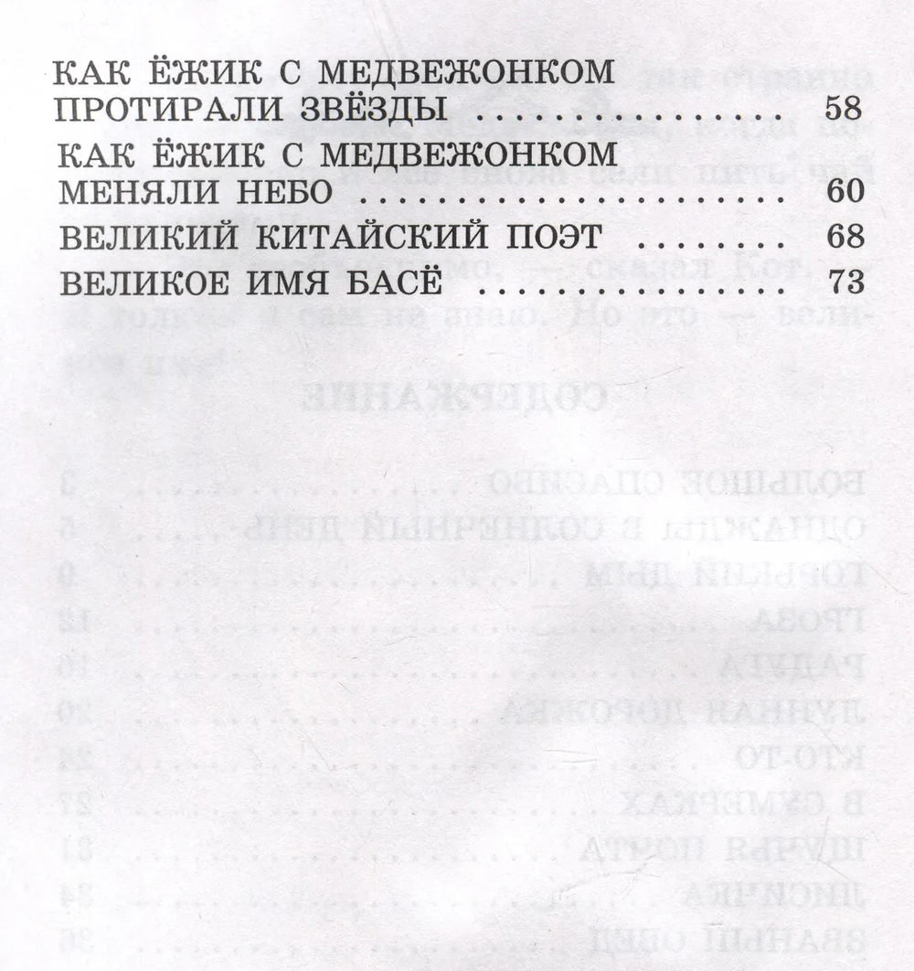 Замечательный сказочник Сергей Козлов придумал очень забавных и трогательных героев. Ёжик и Медвежонок – настоящие неразлучные друзья. Они ходят друг к другу в гости, вместе сумерничают, читают стихи великих поэтов. Ёжик любит протирать звёзды, чтобы они не потускнели, а Медвежонок водит знакомство с Солнечным Зайцем и знает, как перехитрить время. Можно долго рассказывать про приключения этих героев, но лучше прочитать книгу.