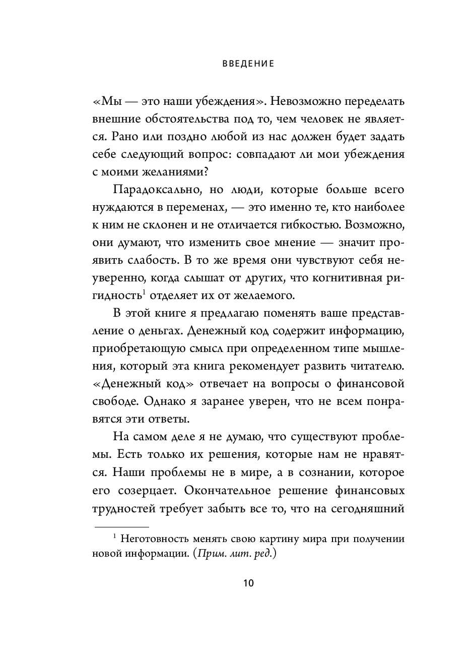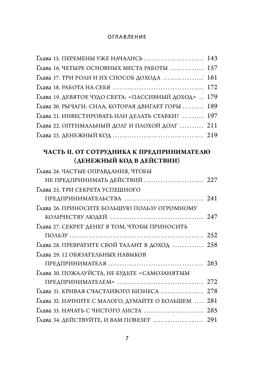 Книга состоит из двух частей: "Финансовая Свобода" – Денежный код и "От сотрудника к предпринимателю" – Денежный код в действии. В первой части основное внимание уделяется образу мышления, во второй – способностям.