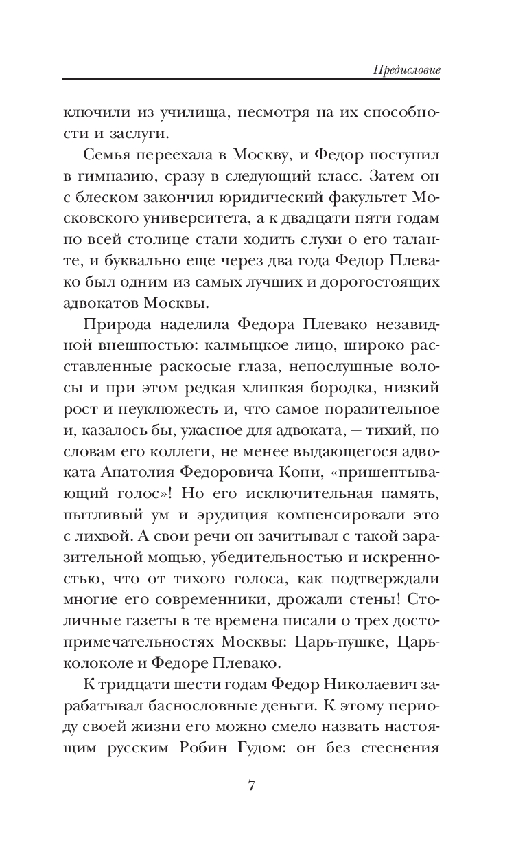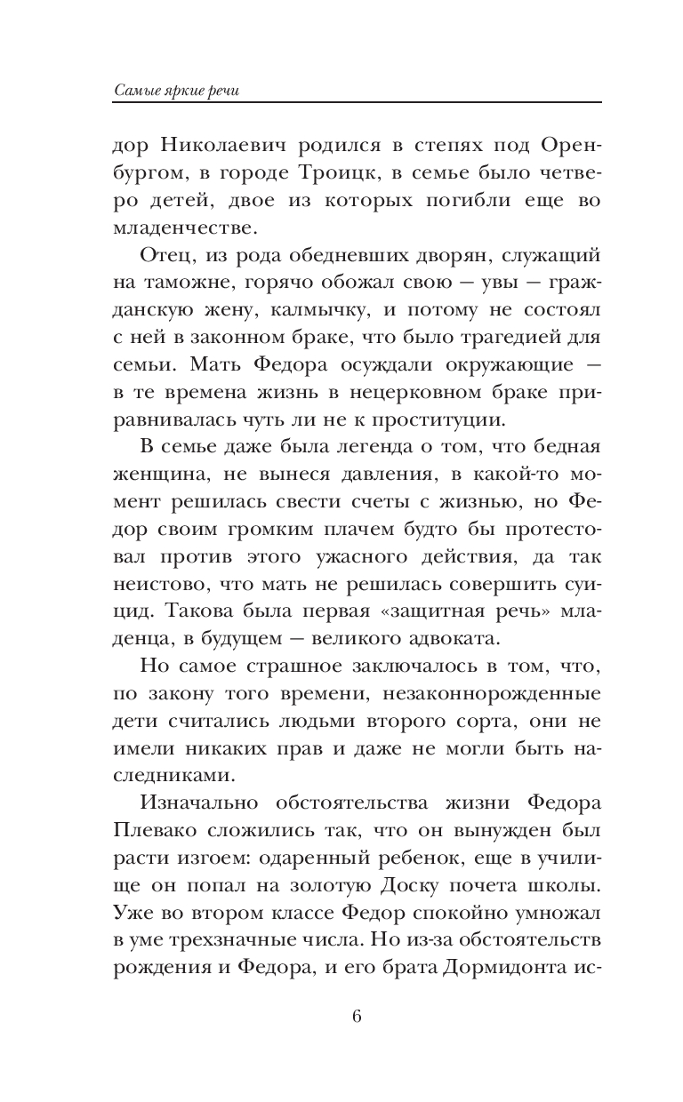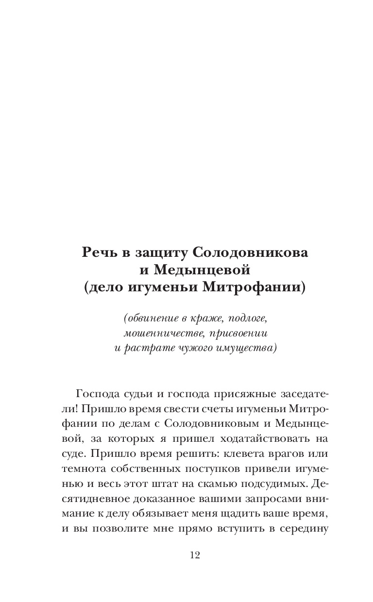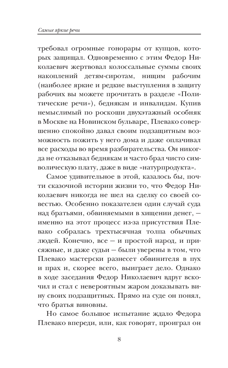 Речи самого знаменитого русского адвоката Федора Плевако увлекательнее любого романа. Проведя более 200 дел, он еще при жизни стал легендой. Рассказы о том, как Плевако удавалось выигрывать практически безнадежные дела, быстро расходились на анекдоты. Он начал адвокатскую деятельность сразу после того, как в России были проведены реформы, сделавшие правосудие гласным, а в уголовный процесс впервые было введено судебное следствие, появился суд присяжных. Состязательность суда потребовала адвокатов. С самого начала своей карьеры Плевако часто брался за защиту обездоленных и неимущих, что обеспечило ему признание и народную любовь. Когда в 1908 году знаменитый адвокат скоропостижно скончался, проводить его в последний путь собрались огромные толпы москвичей всех сословий.