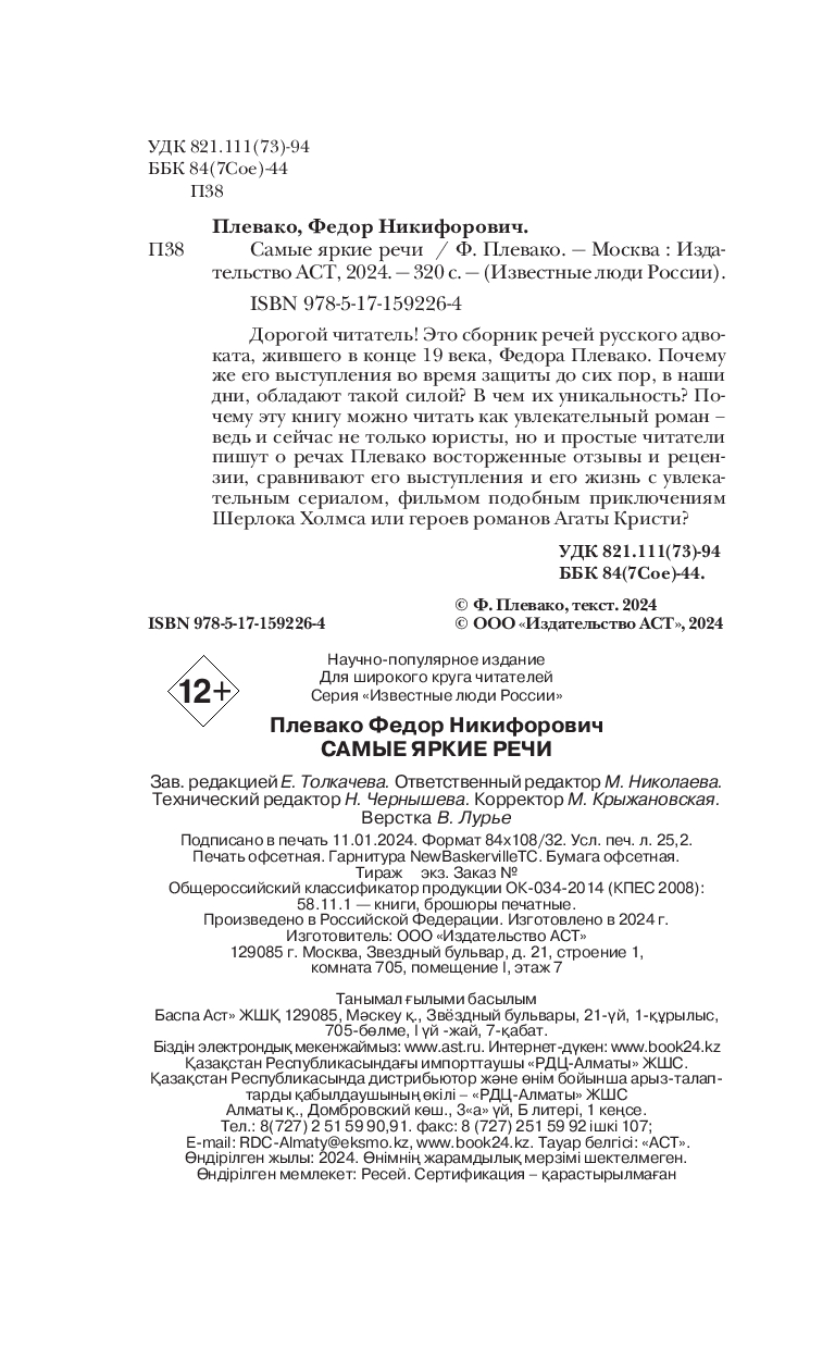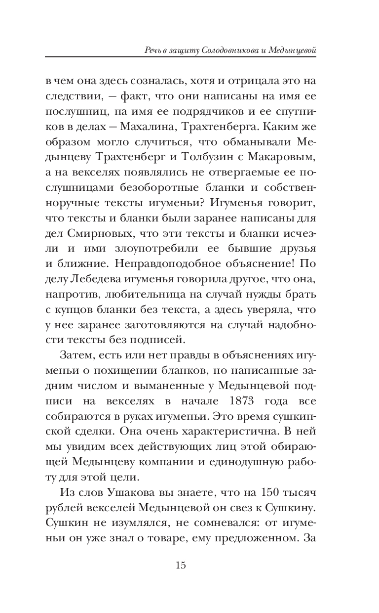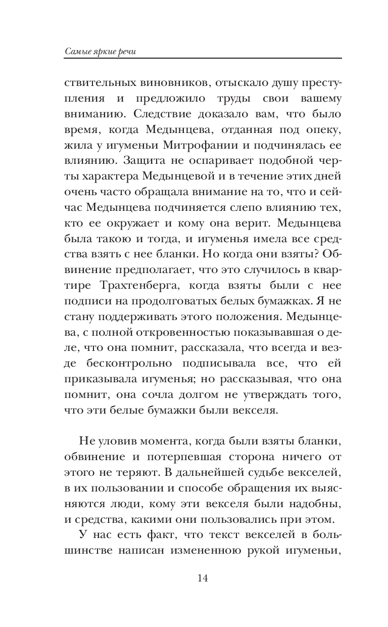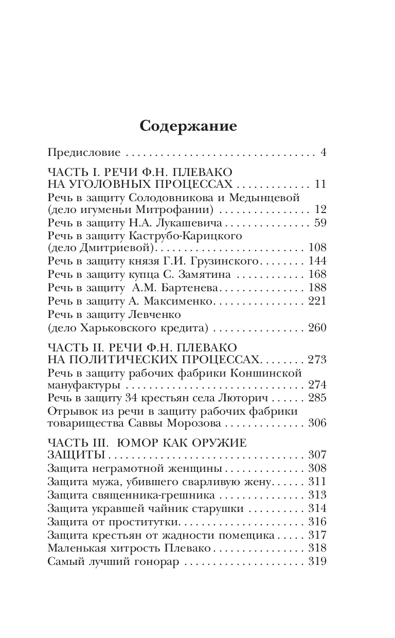 Речи самого знаменитого русского адвоката Федора Плевако увлекательнее любого романа. Проведя более 200 дел, он еще при жизни стал легендой. Рассказы о том, как Плевако удавалось выигрывать практически безнадежные дела, быстро расходились на анекдоты. Он начал адвокатскую деятельность сразу после того, как в России были проведены реформы, сделавшие правосудие гласным, а в уголовный процесс впервые было введено судебное следствие, появился суд присяжных. Состязательность суда потребовала адвокатов. С самого начала своей карьеры Плевако часто брался за защиту обездоленных и неимущих, что обеспечило ему признание и народную любовь. Когда в 1908 году знаменитый адвокат скоропостижно скончался, проводить его в последний путь собрались огромные толпы москвичей всех сословий.