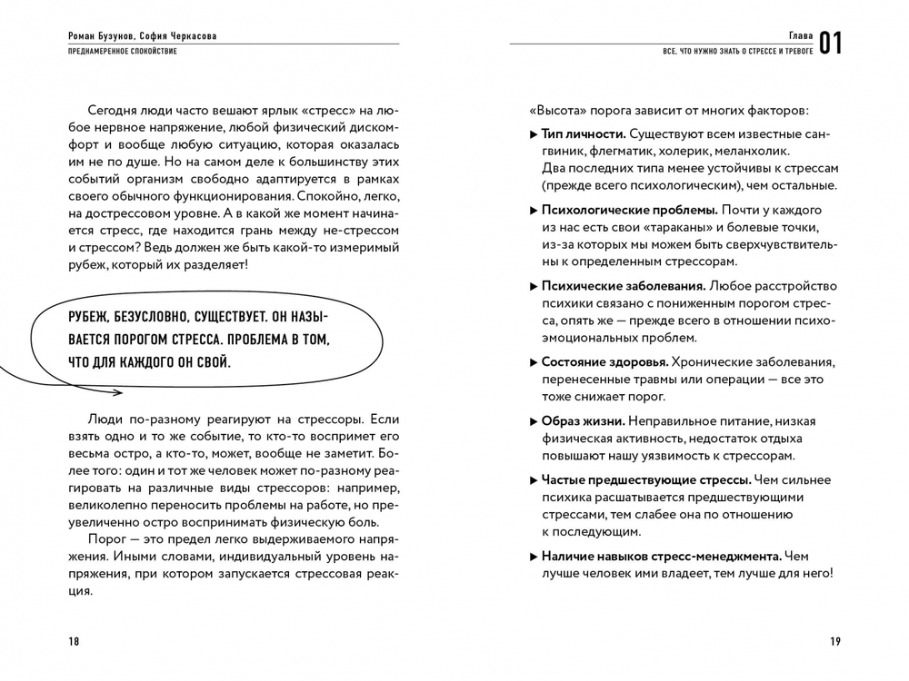 Книга "Преднамеренное спокойствие" будет полезна выгоревшим руководителям и замученным мамам в декрете. Тем, кто находится в поиске работы или изрядно ею перегружен. Людям, избегающим новых знакомств и уставшим от избытка общения. Тем, кто стрессует только по весомым поводам, и тем, кого выводит из равновесия любая мелочь. И всем, кто просто очень устал. Книга дополнена тестами, чек-листами, упражнениями и техниками для работы с мышлением.