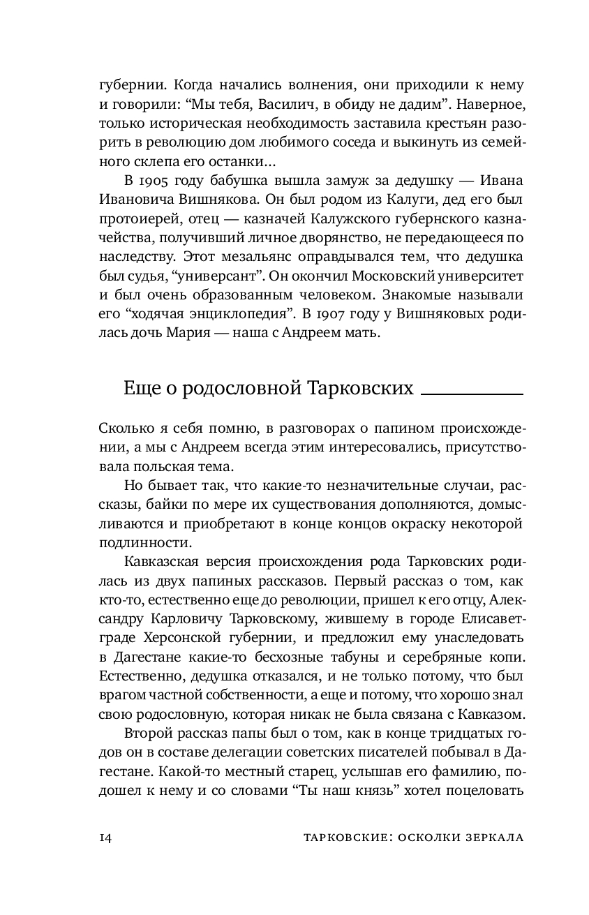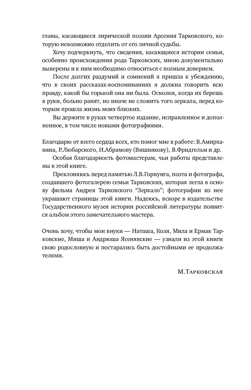"Я пришла к убеждению, что в своих рассказах-воспоминаниях должна говорить всю правду, какой бы горькой она ни была. Осколки, когда их берешь в руки, больно ранят, но иначе не сложить того зеркала, перед которым прошла жизнь моих близких". Марина Тарковская.