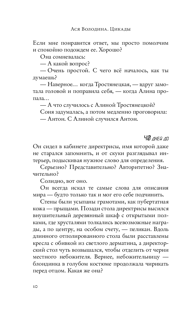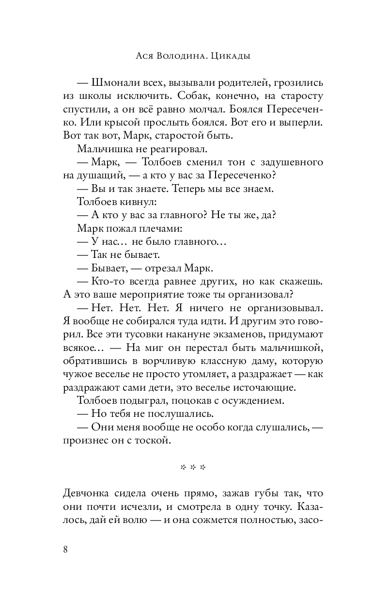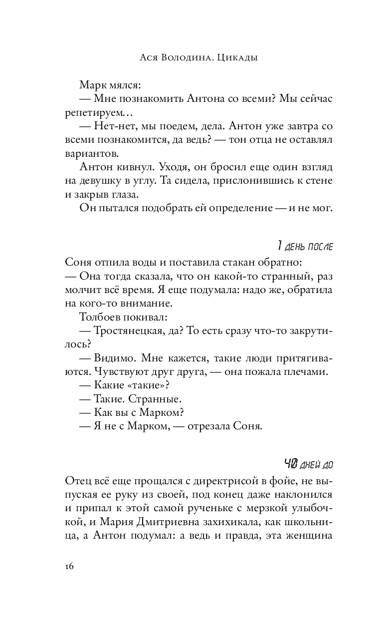 Ася Володина (1991) – прозаик, филолог, преподаватель эстонского языка, автор романов "Протагонист" и "Часть картины". Финалист премии "Лицей", лауреат премии Художественного театра и "Московской Арт-премии".
