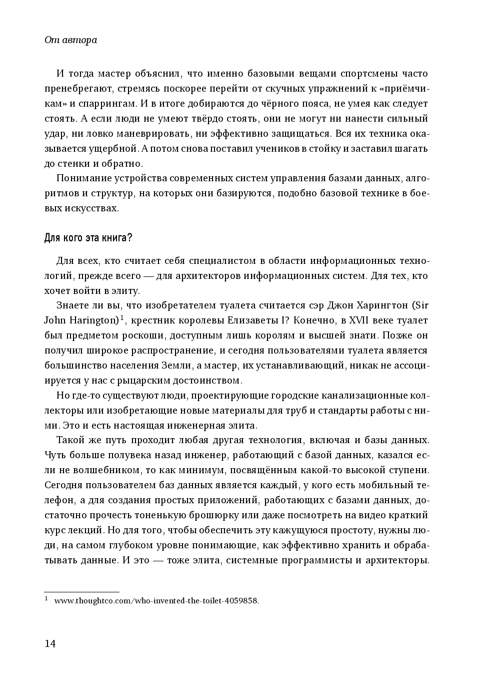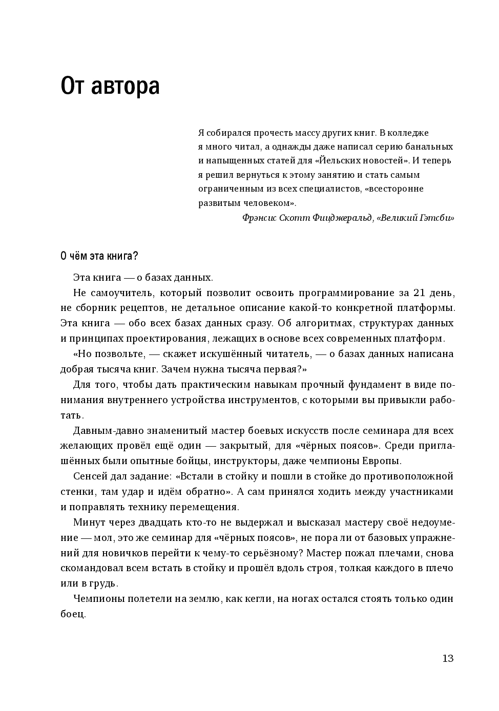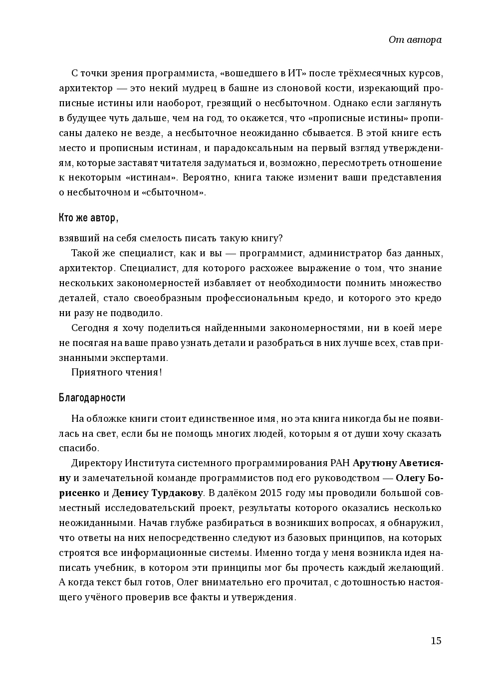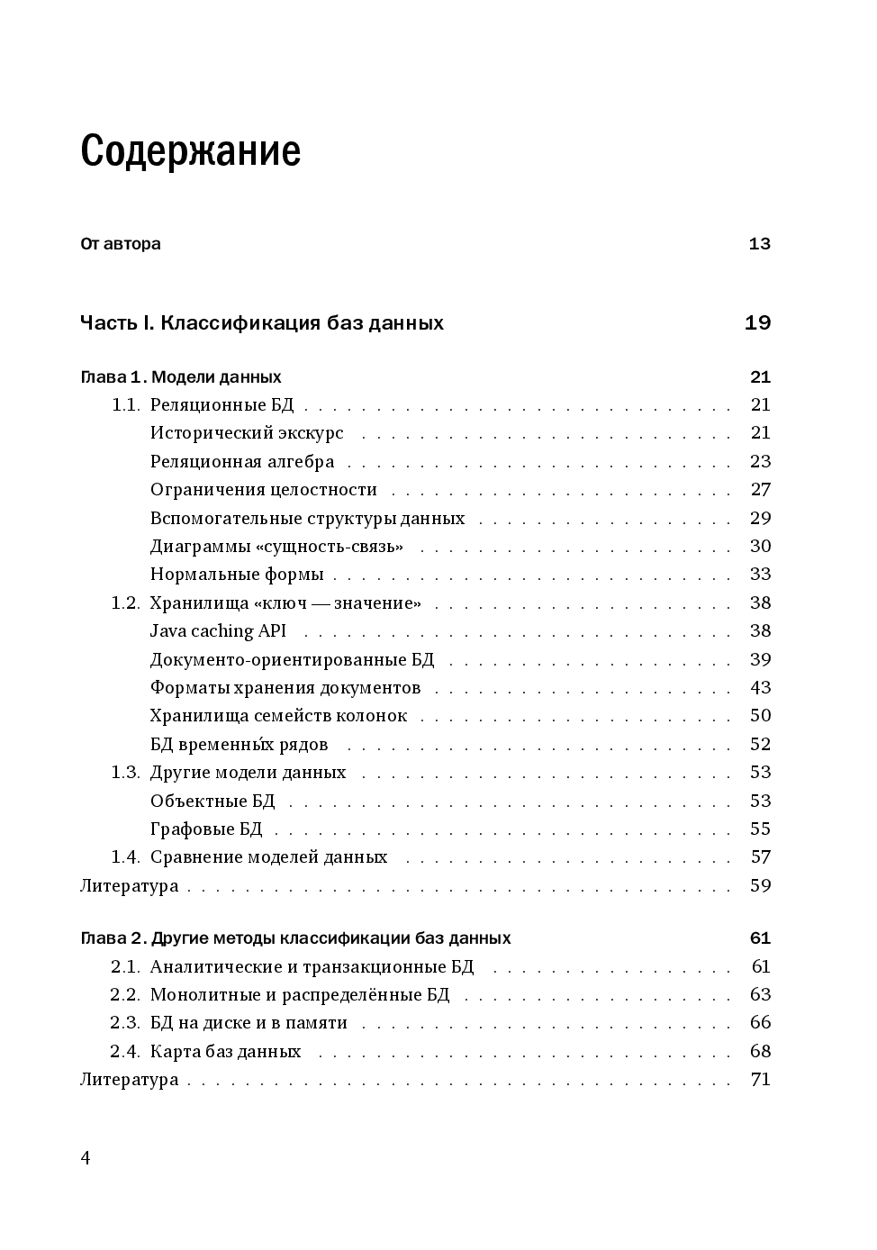 Книга рассказывает об архитектурных принципах, на которых базируются все современные системы управления базами данных, а также об алгоритмах и структурах данных, которые в них используются. Особое внимание уделено сравнению реализаций одних и тех же подходов в близких по функциональности платформах. Кроме того, предлагается оригинальная классификация СУБД, рассматриваются вопросы эксплуатации и обеспечения безопасности.