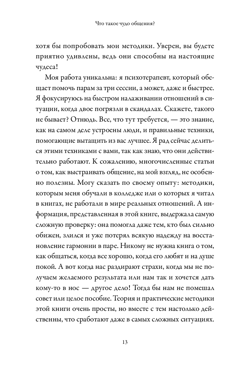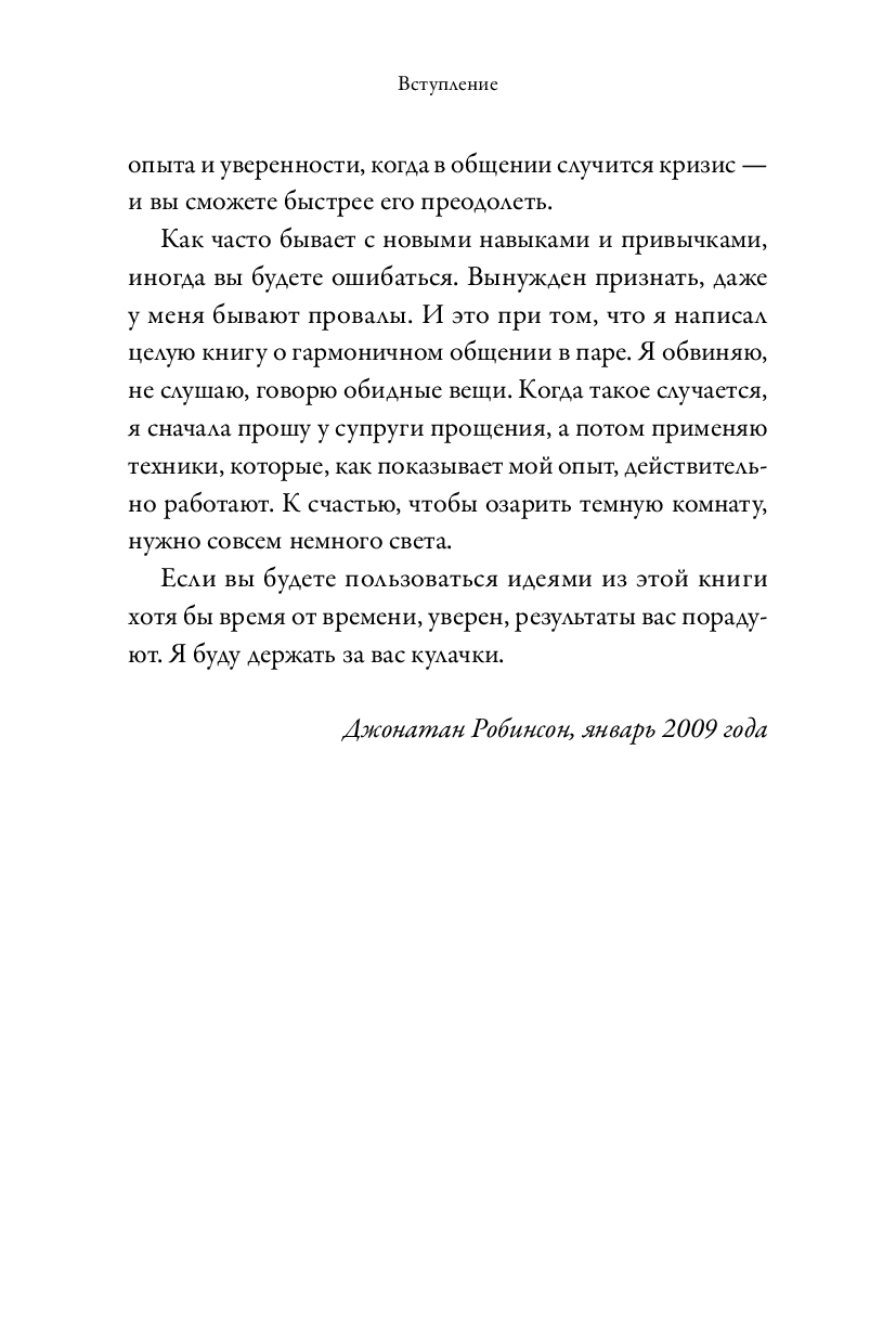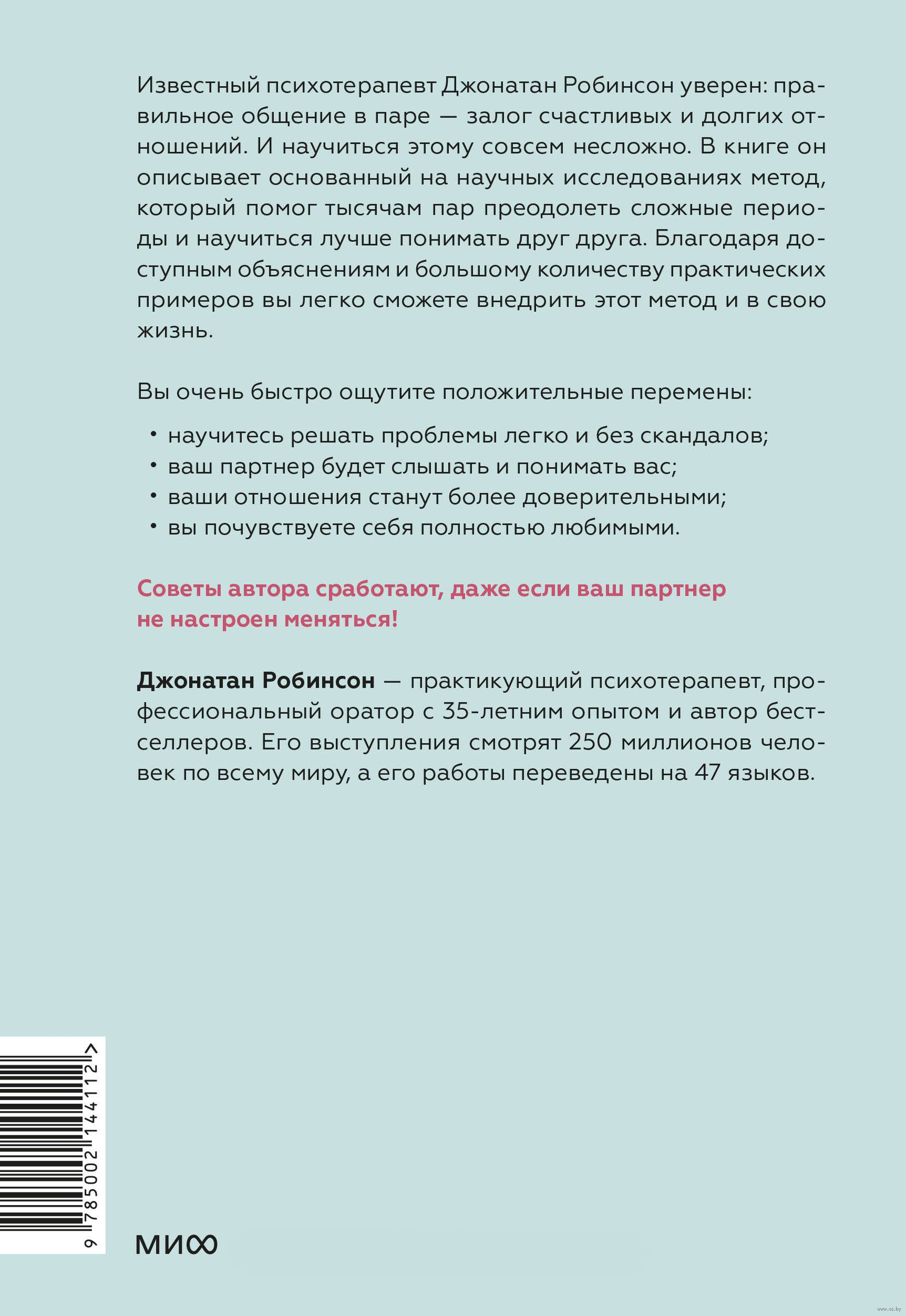 Известный психотерапевт Джонатан Робинсон уверен: правильное общение в паре – залог счастливых и долгих отношений. И научиться этому совсем несложно. В книге он описывает основанный на научных исследованиях метод, который помог тысячам пар преодолеть сложные периоды и научиться лучше понимать друг друга. Благодаря доступным объяснениям и большому количеству практических примеров вы легко сможете внедрить этот метод и в свою жизнь.