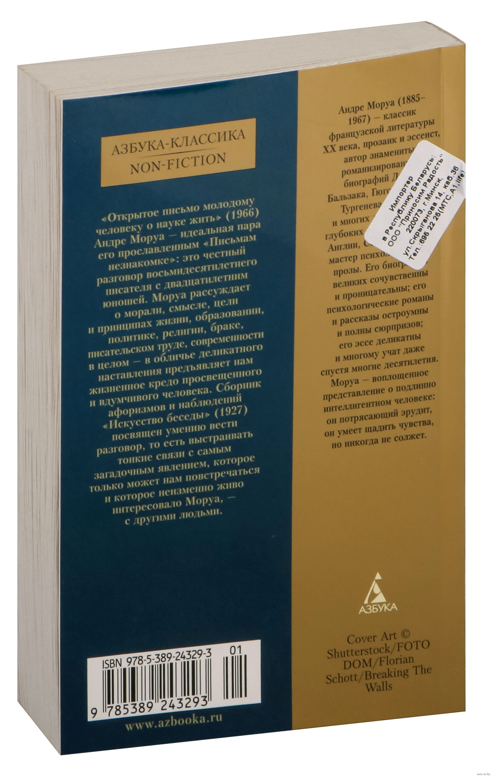 Андре Моруа, классик французской литературы XX века, прозаик и эссеист, потрясающий эрудит, автор изысканных новелл и романов, знаменитых романизированных биографий Дюма, Бальзака, Гюго, Байрона и многих других, создатель глубоких очерков истории Англии, США, Франции, на склоне лет вновь обратился к жанру философского эссе. "Открытое письмо молодому человеку о науке жить" (1966) составляет идеальную пару его прославленным "Письмам незнакомке": это честный разговор восьмидесятилетнего писателя с двадцатилетним юношей. Моруа рассуждает о морали, смысле, цели и принципах жизни, образовании, политике, религии, браке, писательском труде, современности в целом – в обличье деликатного наставления предъявляет нам жизненное кредо просвещенного и вдумчивого человека, и его опыт способен многому нас научить. Сборник афоризмов и наблюдений "Искусство беседы" (1927) посвящен умению вести разговор, то есть выстраивать тонкие связи с самым загадочным явлением, которое только может нам повстречаться и которое неизменно живо интересовало Моруа, – с другими людьми.