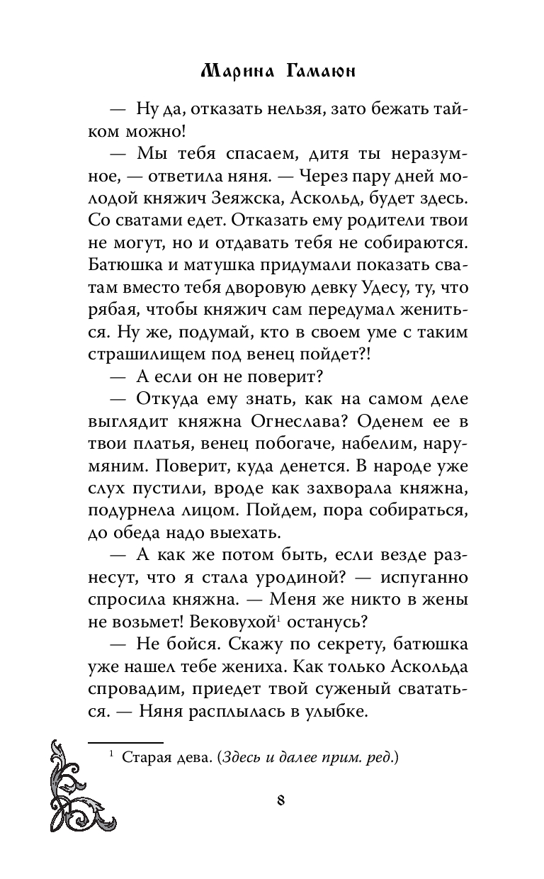 Терзаясь сомнениями, Огнеслава обращается за помощью к ведьме, и та предсказывает: "Мужем тебе князь так и не станет, предашь ты его и погубишь!" Неужели она окажется погибелью жениха и причиной многих бед? Чтобы избежать нежеланной судьбы, княжна должна вонзить заговоренный клинок в сердце того, кто носит кольцо в виде стальной змеи. Но что, если оно окажется на руке князя? Сможет ли Огнеслава совладать с судьбой? Или станет добычей змея?