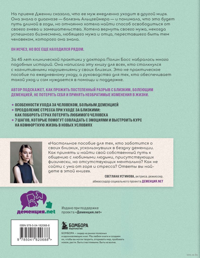 Доктор Полин Босс считает деменцию ярким примером неоднозначной потери. С помощью этой книги, пронизанной щемящим чувством нежности и грусти, автор оказывает поддержку тем, кто столкнулся с когнитивными нарушениями у близкого человека.