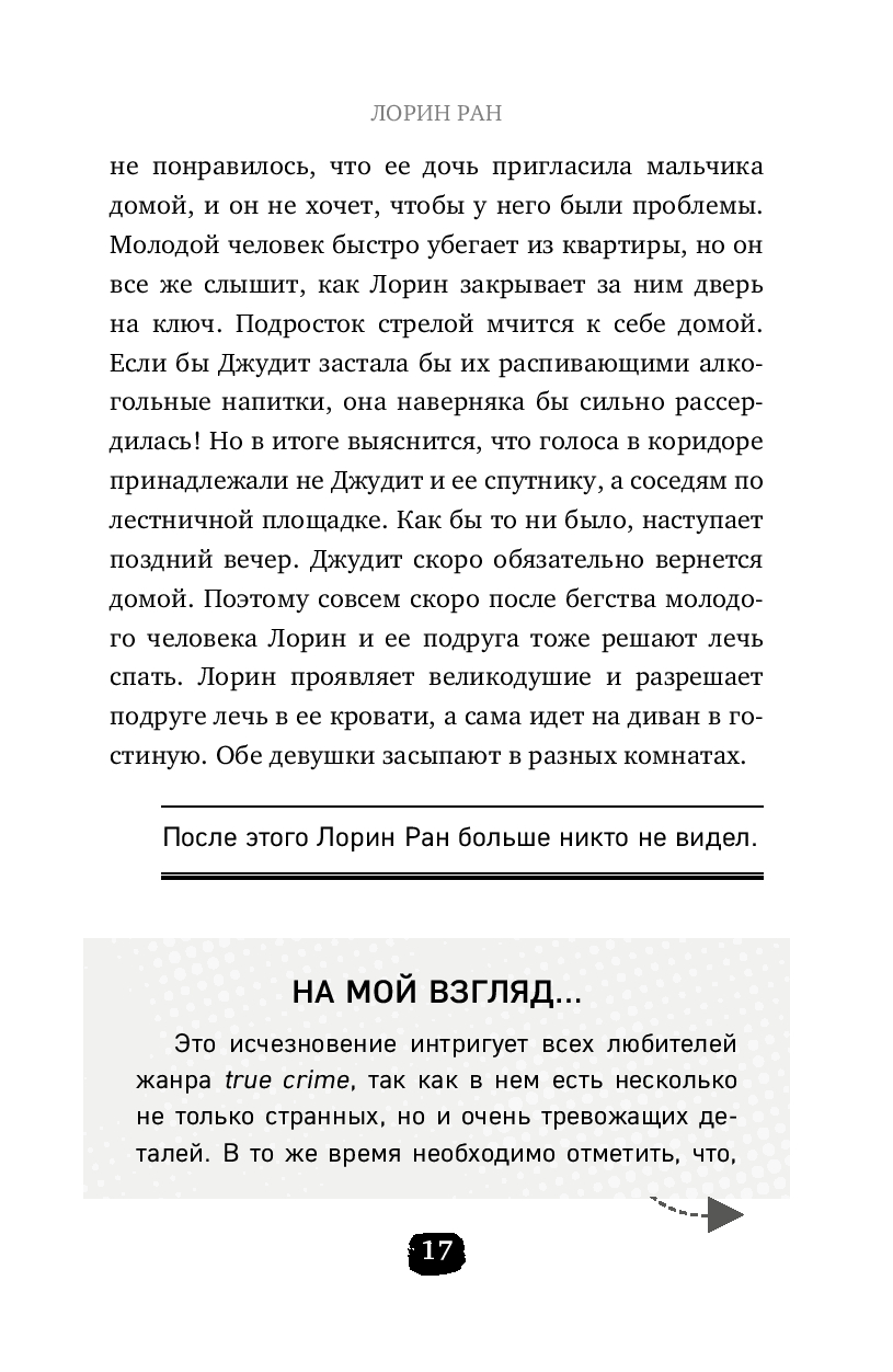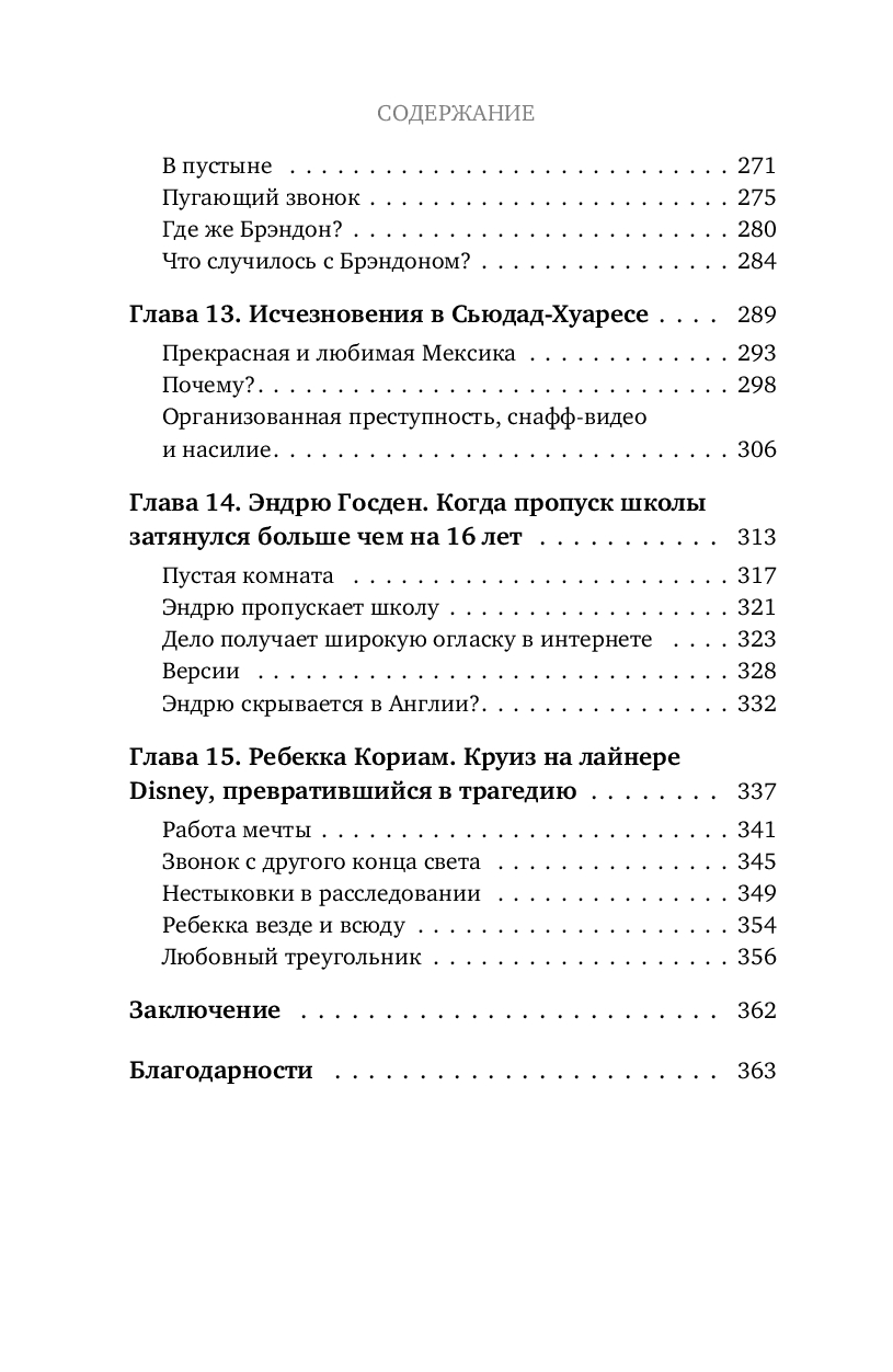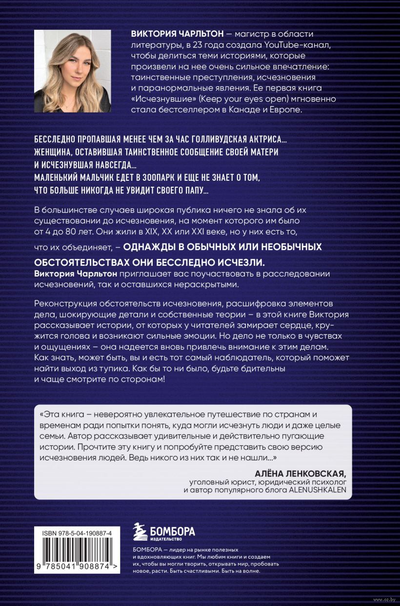 Ведущая YouTube-канала Виктория Шарльтон, ставшая известной благодаря своим видео в жанре true crime знакомит нас с 15 самыми загадочными исчезновениями за последние 100 лет, которые произошли в разных странах от Франции до США и Квебека. Восстановление фактов, расшифровка элементов расследования, связанные с поисками необычные истории и собственные версии: Виктория предлагает нам захватывающие истории, заставляющие замирать сердце в тревожном ожидании и вызывающие бурю эмоций. Как знать, может быть, вам уже приходилось случайно сталкиваться с Джонни, Тимоти, Лорин и Дианой? Зато нет никаких сомнений в том, что, прочитав эту книгу, вы всегда будете бдительными. Просто потому, что исчезнувший человек достоин того, чтобы его искали и помнили.