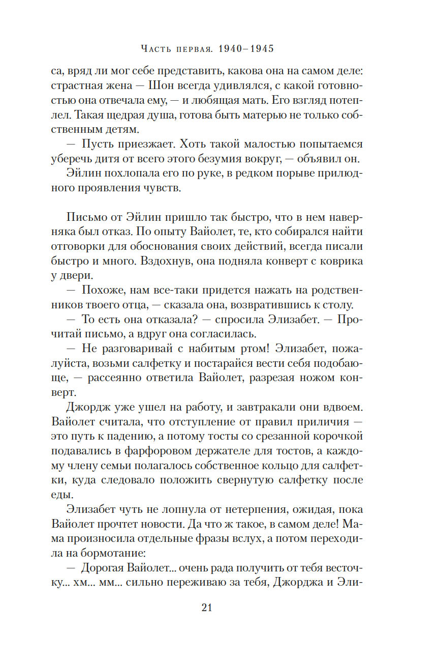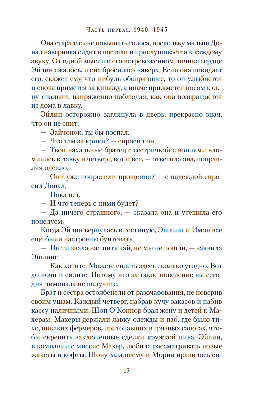 Элизабет было всего десять лет, когда ей пришлось покинуть родной дом. В Европе шла война, Лондон бомбили, и родители решили отправить дочь в более безопасное место – в далекий ирландский городок. Девочку приютила большая, многодетная, суматошная семья, и жизнь Элизабет совершенно изменилась. Но самое главное – у нее появилась близкая подруга Эшлинг. Они сумели сохранить дружбу на долгие годы, веря, что их отношения выдержат любые трудности и испытания...