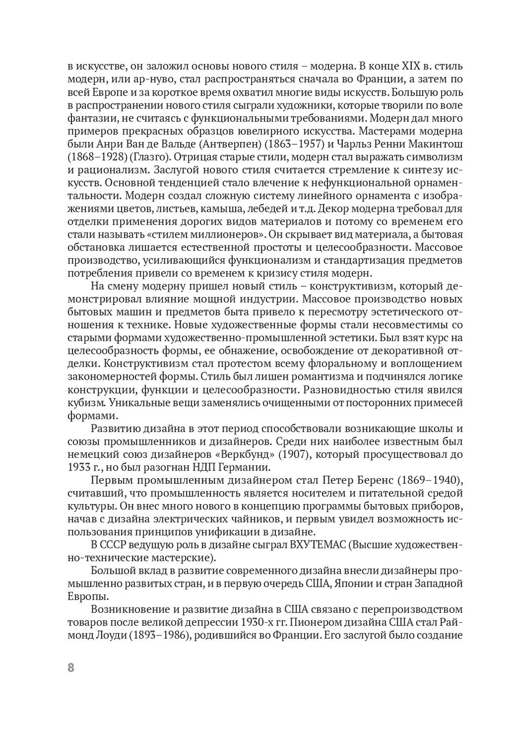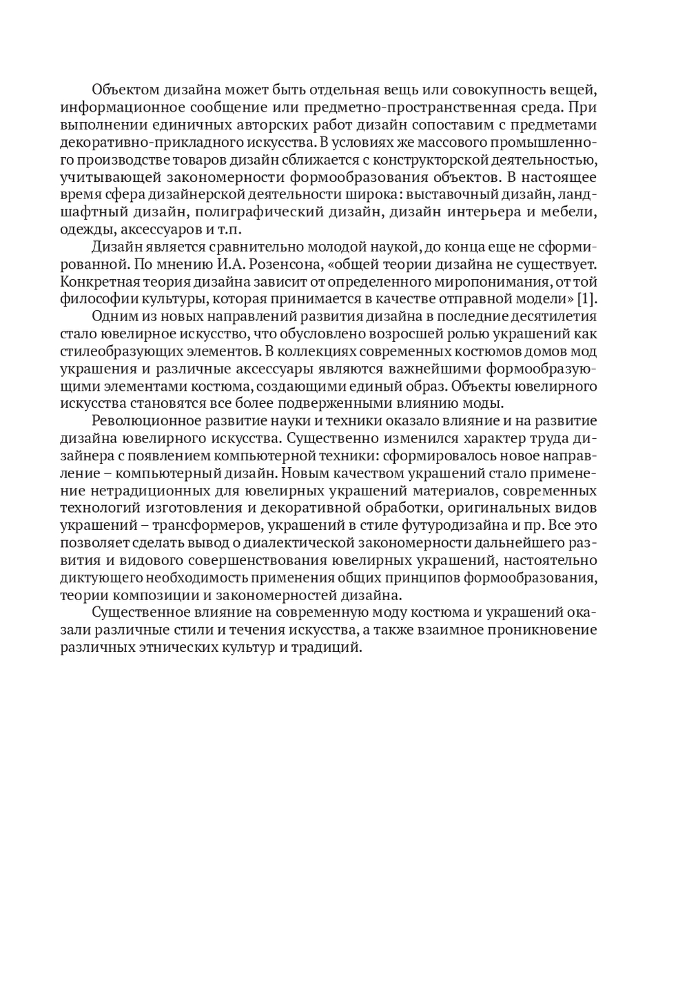 Изложены общие сведения об истории ювелирного искусства и тенденциях развития ювелирного дизайна, освещены основные принципы формообразования изделий на основе теории композиции. Приведены краткая история развития стилей в ювелирном искусстве, закономерности возникновения моды и ее влияние на формирование покупательского спроса на ювелирные товары. Даны классификация ювелирных изделий и рекомендации по проектированию ювелирных украшений с вставками из драгоценных и недрагоценных материалов, декоративному оформлению. Приведены описания основных видов ювелирных изделий и их конструктивные особенности исполнения.