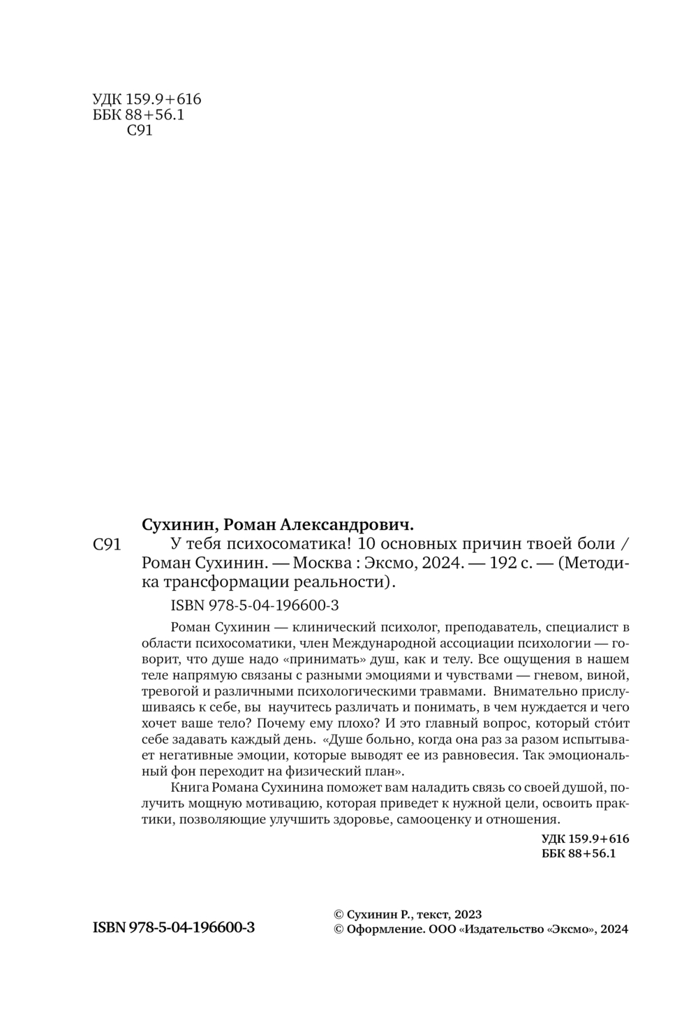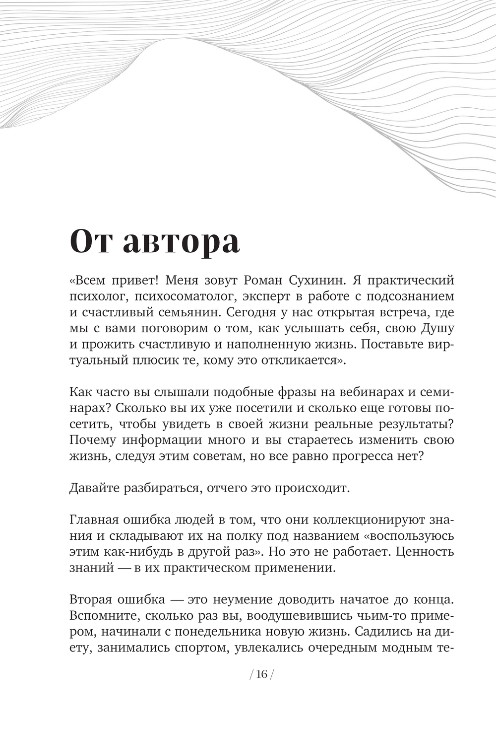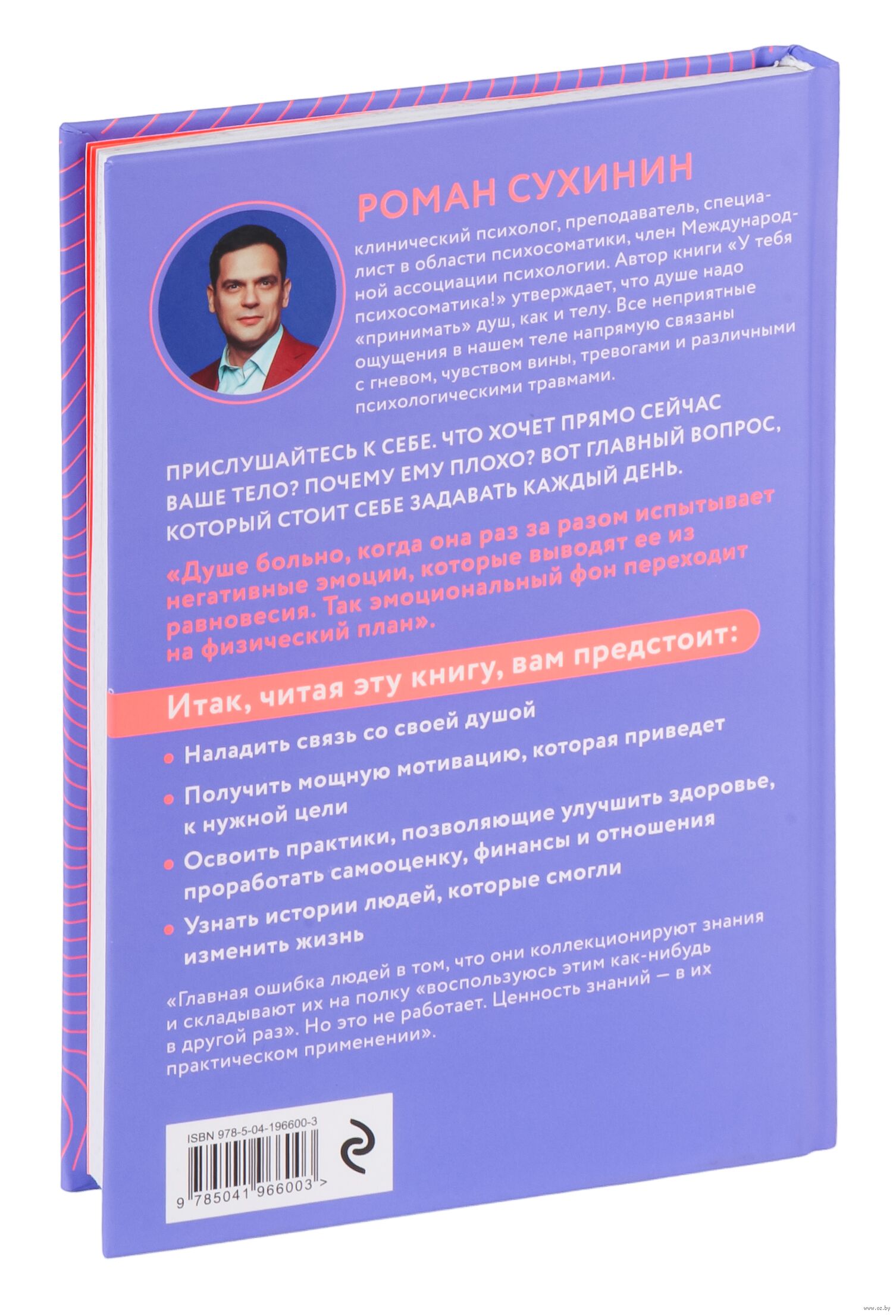 Прислушайтесь к себе! Что хочет ваше тело прямо сейчас? Что вы ощущаете? Почему вам плохо и больно? Именно эти вопросы стоит научиться задавать себе каждый день! Роман Сухинин – клинический психолог и специалист в области психосоматики – говорит, что вашей душе больно, когда она раз за разом испытывает негативные эмоции, которые выводят ее из равновесия. И в этот момент эмоциональный фон переходит на физический уровень. Есть 10 базовых причин, почему это происходит. Благодаря книге Сухинина вы научитесь налаживать связь со своей душой, освоите практики, позволяющие улучшить здоровье, общее самочувствие и повысить свою самооценку.