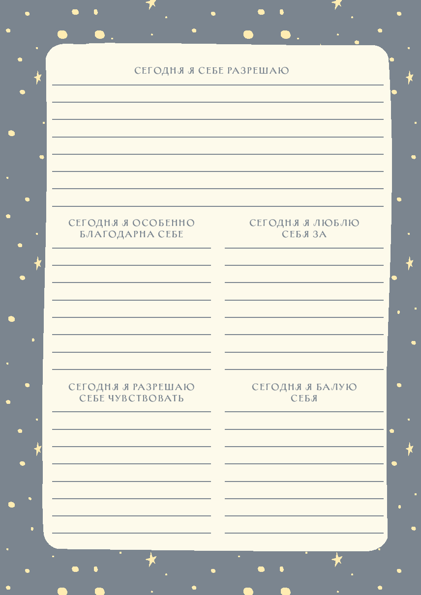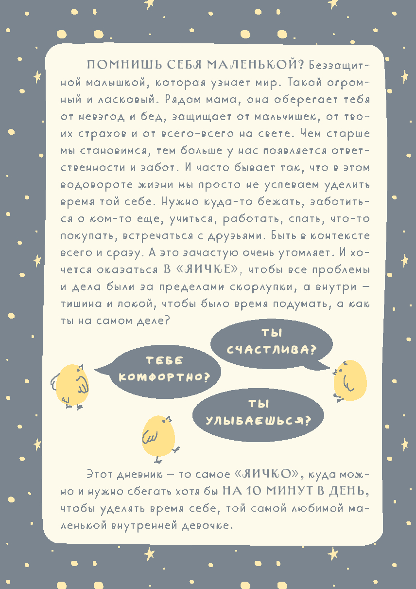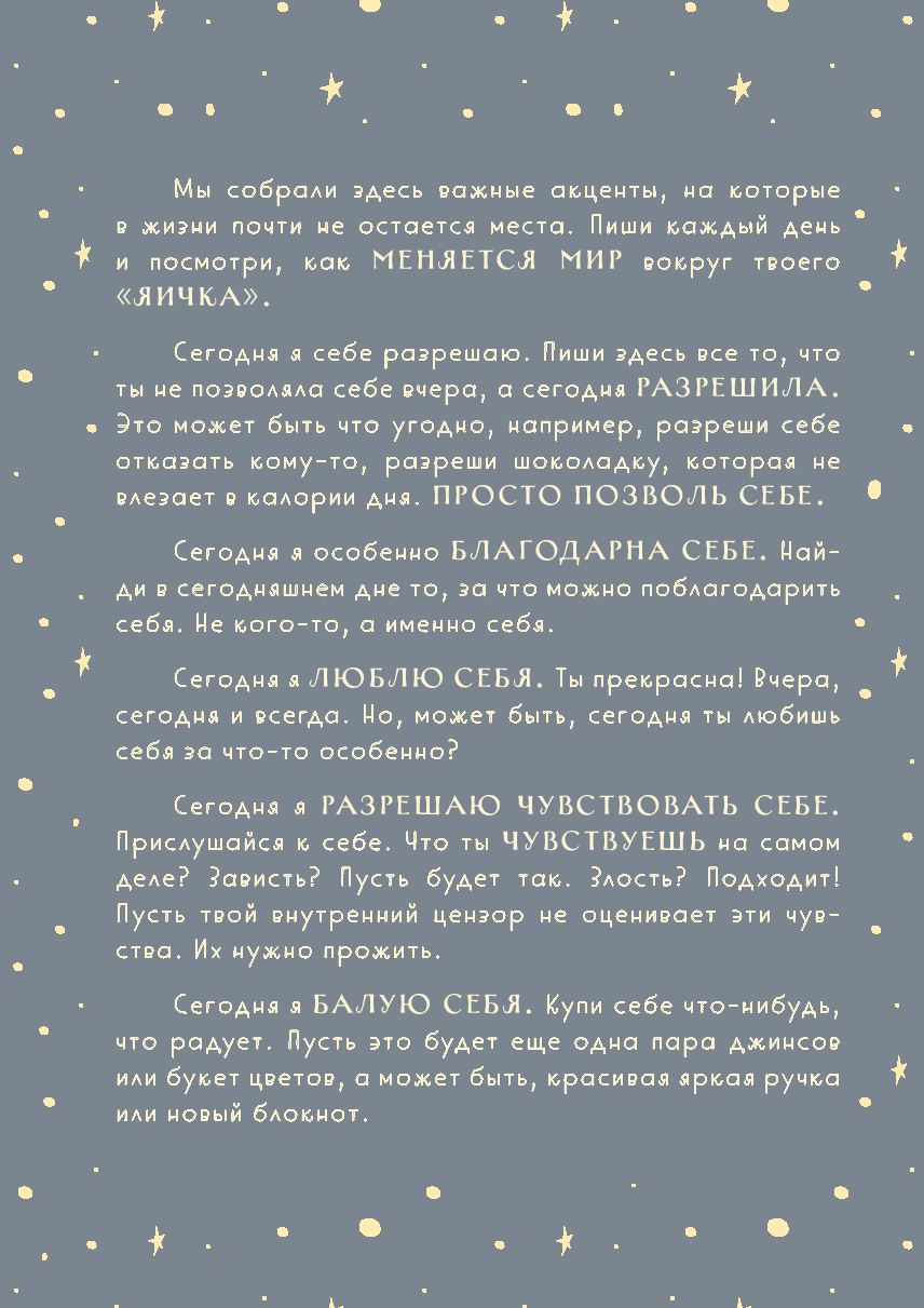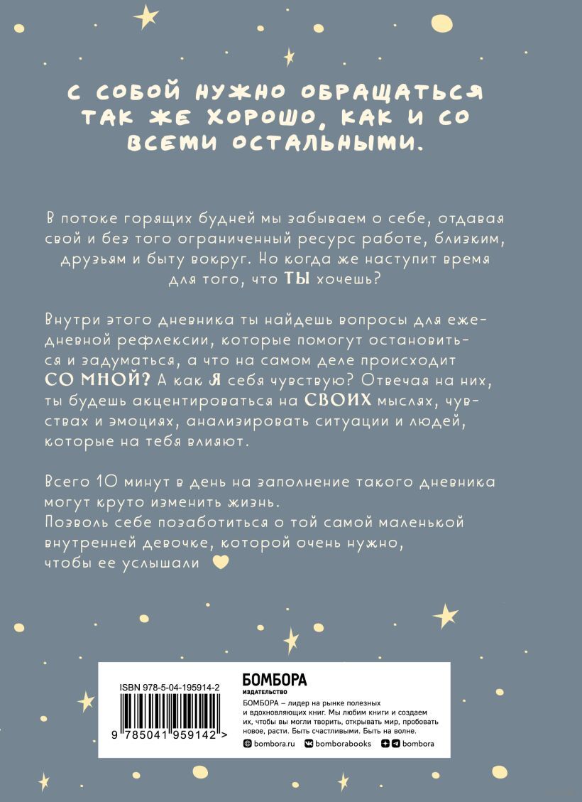 Внутри этого дневника ты найдешь вопросы для ежедневной рефлексии, которые помогут остановиться и задуматься, а что на самом деле происходит СО МНОЙ? А как Я себя чувствую?