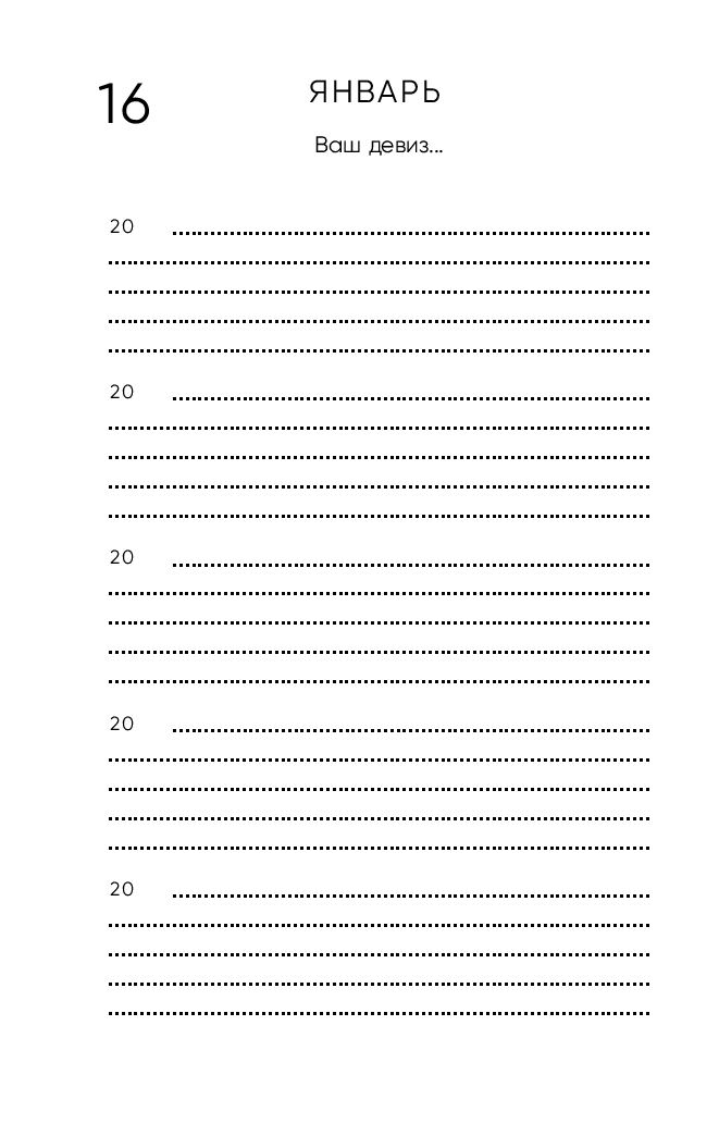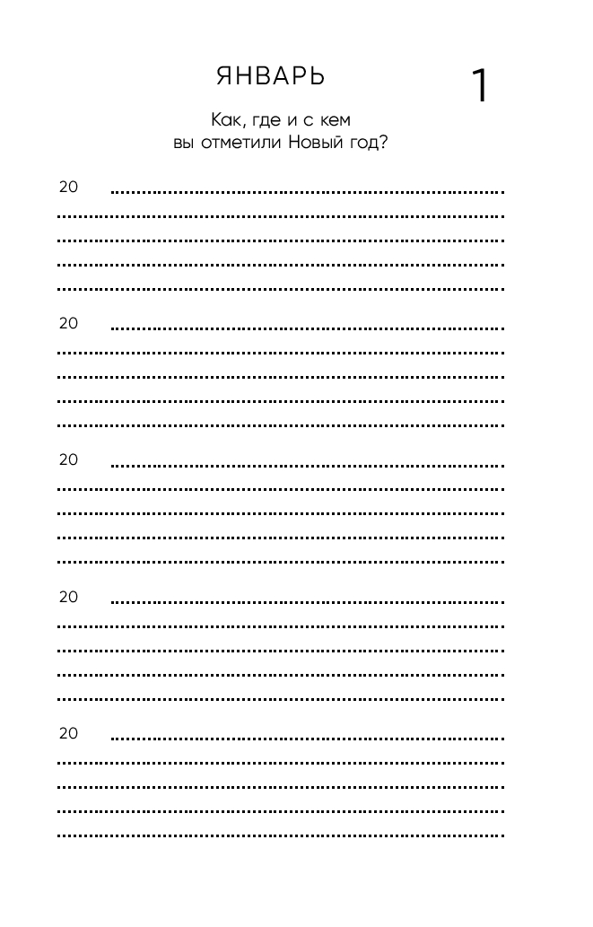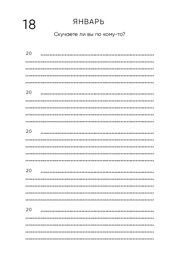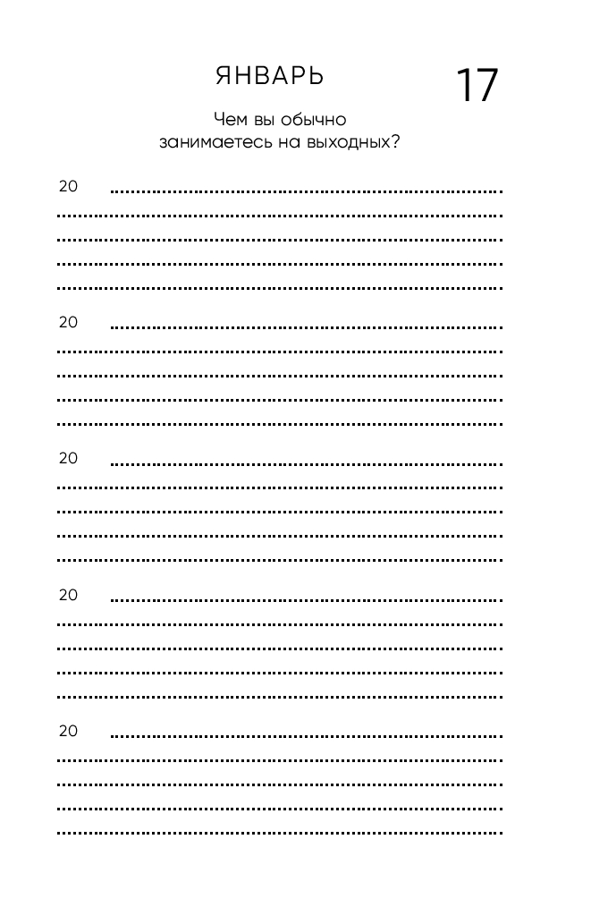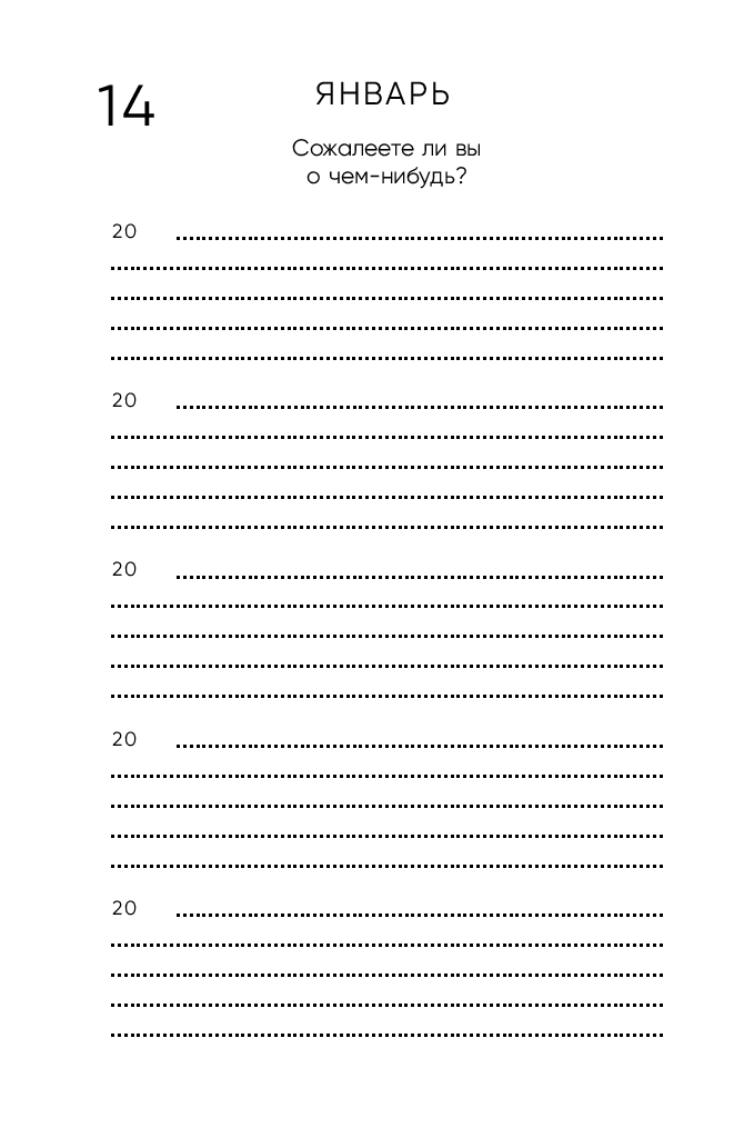 Дневник не привязан к конкретному году и дню недели – начинайте в любой день. Просто найдите сегодняшнее число, укажите год и каждый день заполняйте всего по 3-4 строчки, а когда год закончится, продолжайте вести дневник с первого листа. Таким образом, вы отвечаете на одни и те же вопросы в разные годы и наблюдаете, как меняется ваша жизнь и мысли.